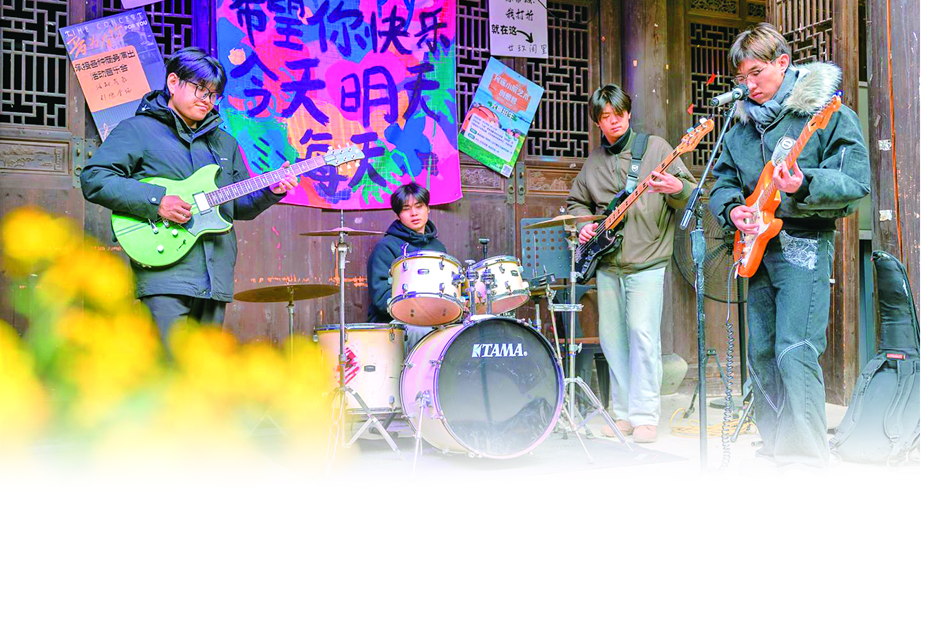 去年3月,学习声乐的陈嘉诺在一次学校的社团活动中,有了组建乐队的想法,恰好高中时期的好朋友陈颖会弹贝斯,两人一拍即合,又找到了同校的吉他手徐世杰和鼓手王嘉宇,4人组建了乐队“廿”。“叫这个名字,是因为我们都20岁,浦江方言读音是廿。”