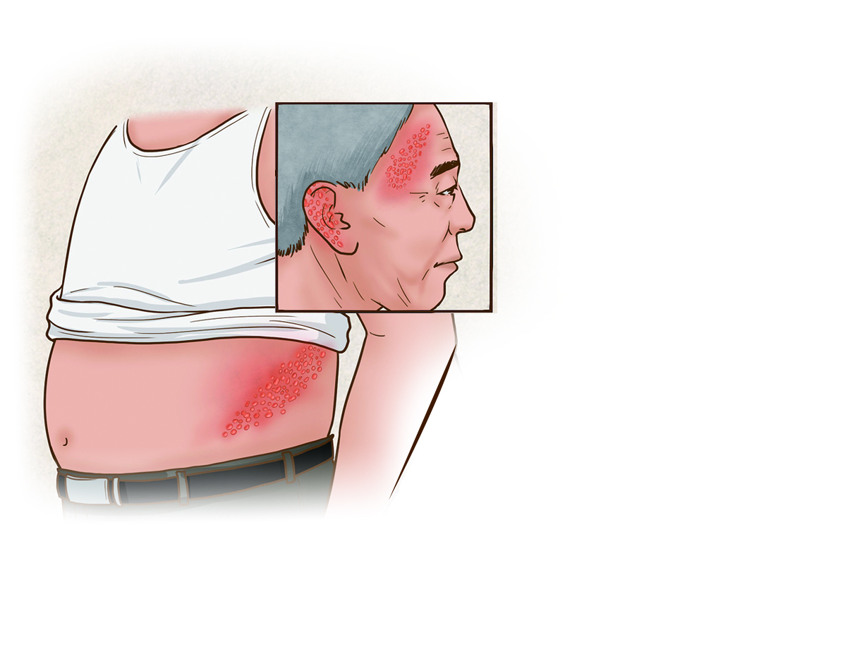 出疹期:在身体一侧(不超过中线)的皮肤上出现成簇的红色丘疹,并迅速变为水疱,伴有剧烈疼痛。常见于胸背部、腰部、头面部。