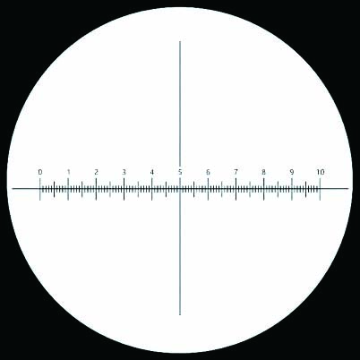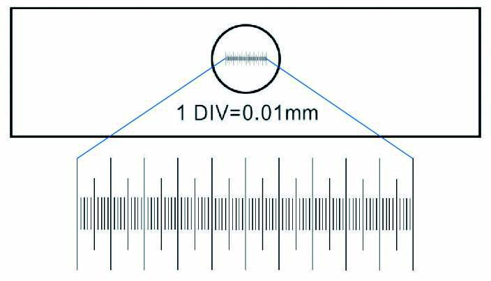 ②物镜测微尺(图2):一个载玻片上面有已知精确长度的刻度(1mm被等分为100小格)。