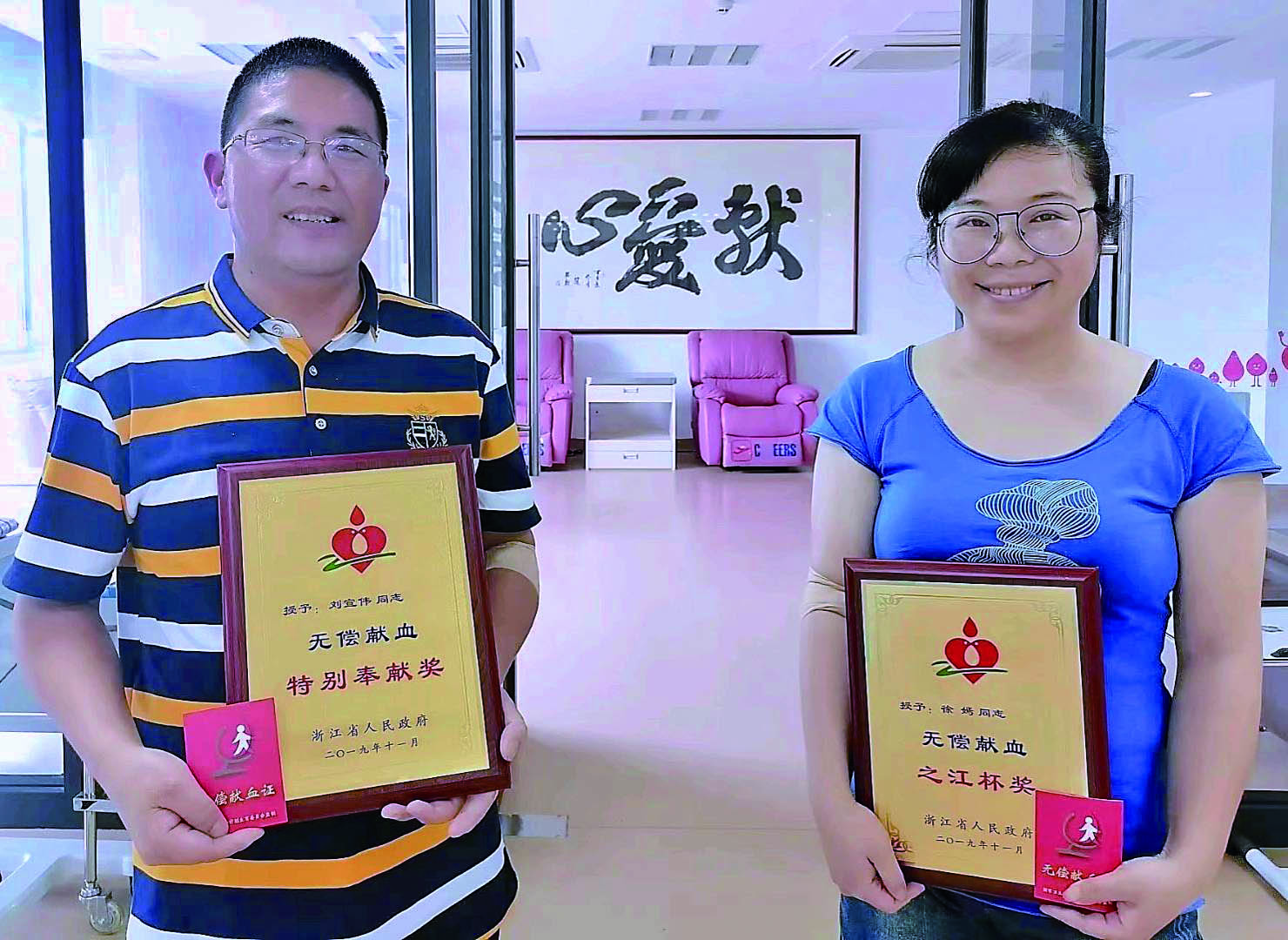刘宣伟的妻子徐嫣也是一名医务人员,“看着他每月奔波献血,我既佩服又心疼。”徐嫣告诉记者,在丈夫的影响下,她也成为了无偿献血的“常客”。截至目前,徐嫣累计献血130次,献血量达4.65万毫升。夫妻俩还多次一起站上领奖台,国家级无偿献血奉献奖金奖证书、浙江省无偿献血之江杯奖奖杯等,被他们整齐地摆放在家里书柜的显眼处,“这是我们家最珍贵的‘军功章’。”