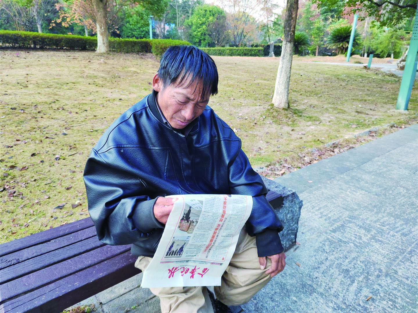 12月20日清晨,在市区湖海塘公园,一名贵州籍外来务工人员坐在凳子上,认真阅读当天出版的《金华晚报》。 通讯员 张益民 文/摄