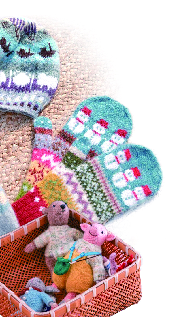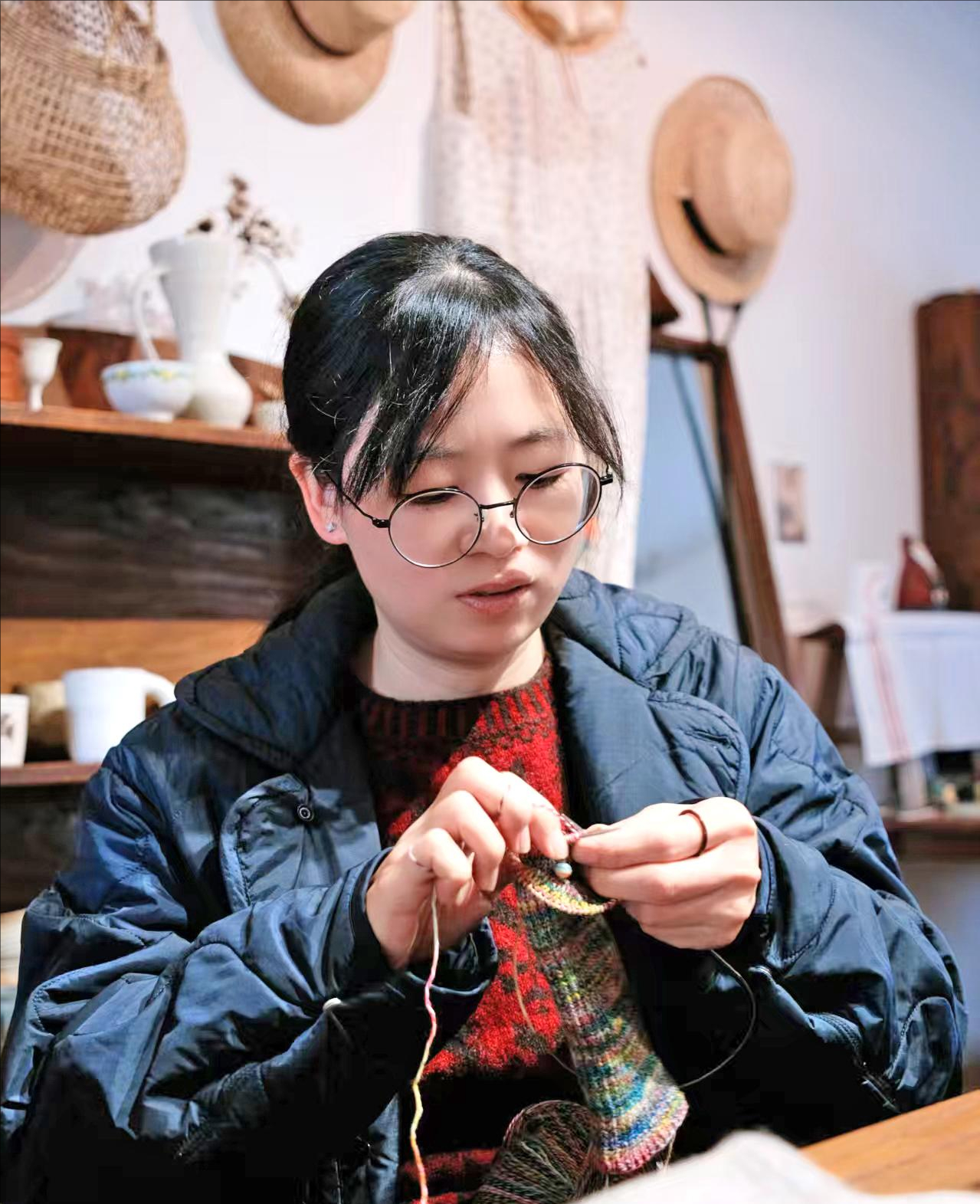 坐在靠背木椅上,蔚蓝的手指在棒针上飞快穿梭,彩色毛线一点点成型,变成袜筒的模样。木桌上摆放着的都是她的作品,配色惊艳的美杜莎披肩、图案精巧的旋转木马提花毛衣、小雪人造型的全指手套、蕨草图案的毯子、憨态可掬的小猪斜挎包……两个小竹筐里还有各种各样的棒针玩偶。