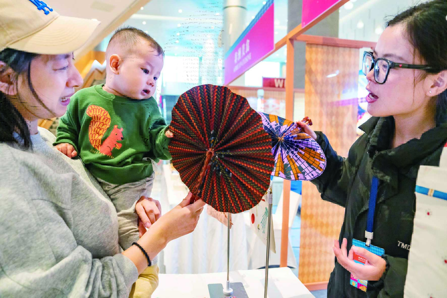 @星空:在一场旅游大集活动现场,来自非洲的折扇吸引了一名8个月的宝宝反复研究,不愿撒手。 傅俊 摄