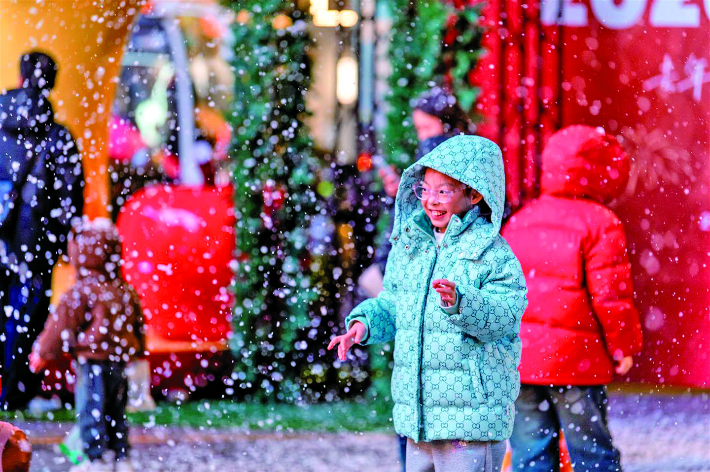 12月21日晚,市区一商圈广场上,在2026年跨年倒计时牌前,市民在人造雪的欢乐氛围中,感受新年即将来临的快乐。 本报记者 胡肖飞 文/摄