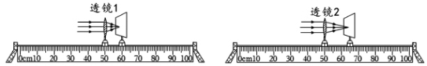 小科将两个凸透镜分别固定在光具座上,并用一束平行于主光轴的光,分别射向两个凸透镜,调节光屏的位置,直至在各自光屏上形成一个最小的亮斑,如下图所示。