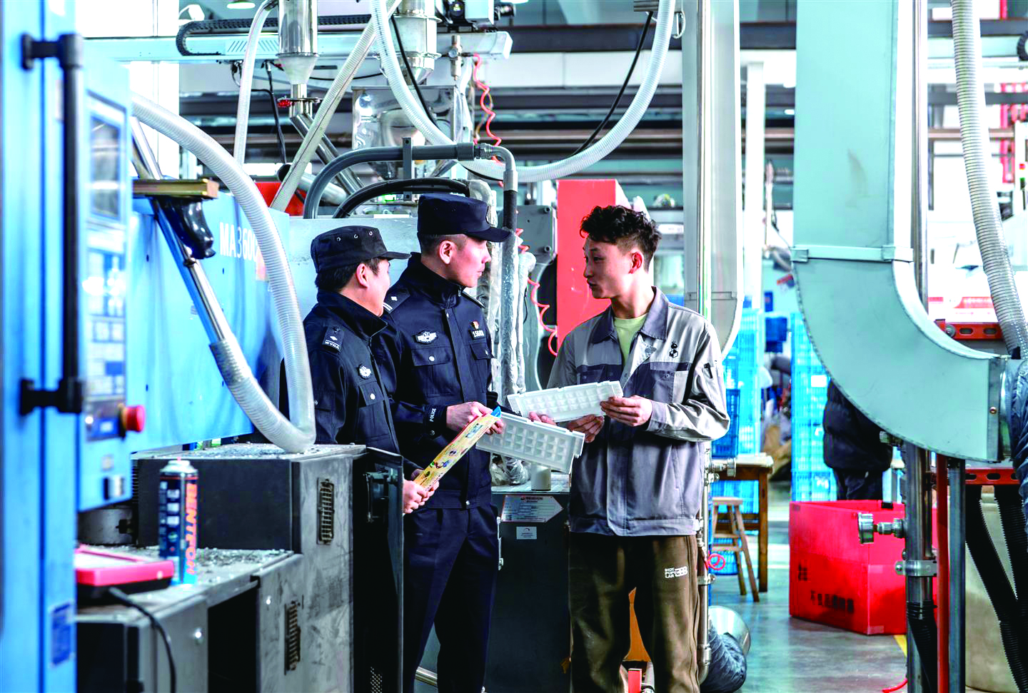 武义县公安局桐琴派出所聚焦岁末年初企业安全需求,主动靠前、精准服务,组织民警辅警深入辖区企业开展走访活动,排查化解风险隐患,开展反诈等安全宣传,为企业生产经营筑牢安全屏障。 图为12月23日,民警辅警在企业走访宣传。 徐文荣 柴晶 摄