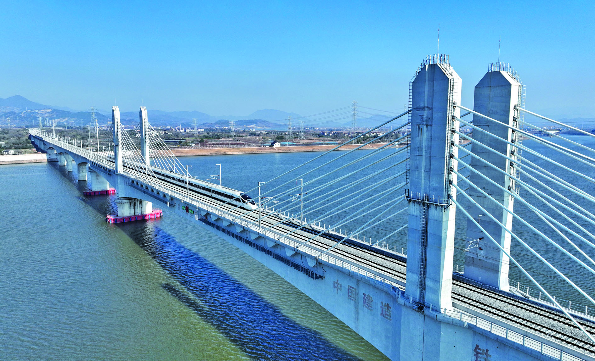 连日来,在金建高铁兰溪市兰江特大桥上,动车组列车飞驰而过。金建高铁兰溪至建德段从12月26日开始试运行,时间持续一个月左右,预计2026年一季度具备开通运营条件。 本报记者 时宽兵 摄