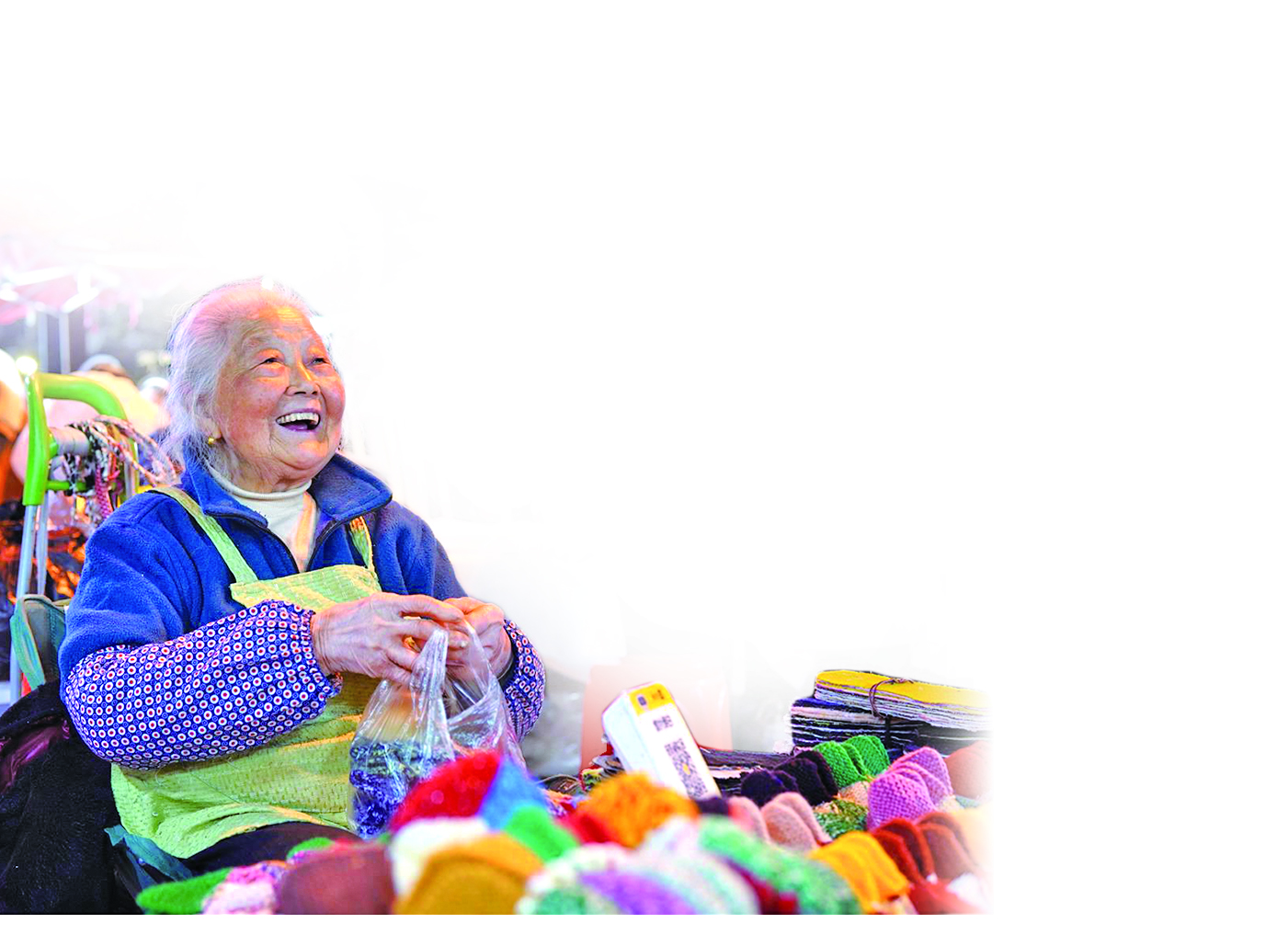 两名金东老乡在小摊上选购了大人款的鞋袜,准备冬天在铺地板的房间里穿。“开价38元一双,便宜点,就35元好了。”周奶奶拿塑料袋装起来,递给客人,又送上一句吉祥话,“祝你长寿平安”。另一名客人给自己和女儿挑了两双手套,周奶奶报了最低价24元一双。手机扫码支付成功,客人一共付了50元,周奶奶道了声“谢谢”。