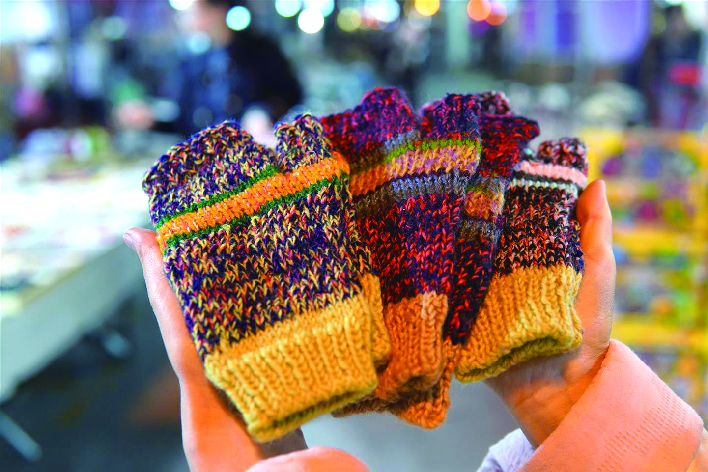 周奶奶的小摊主要是三类手工产品:鞋垫、鞋袜和手套。材料大多源于他人的馈赠——女儿同学做衣服剩的碎布、别人闲置不用的毛线。她将这些材料仔细整理,注入新的生命。