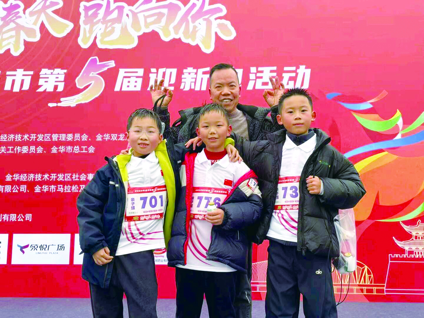 同一天,金华市第五届元旦迎新跑活动如期举行,市区东苑小学等校都有班级集体出列。金华市荣光学校403班班主任申盼路带着学生与家长冒雨出征。风雨之中,孩子们展现出惊人的毅力与出色的身体素质,赢得沿途跑友的阵阵称赞。