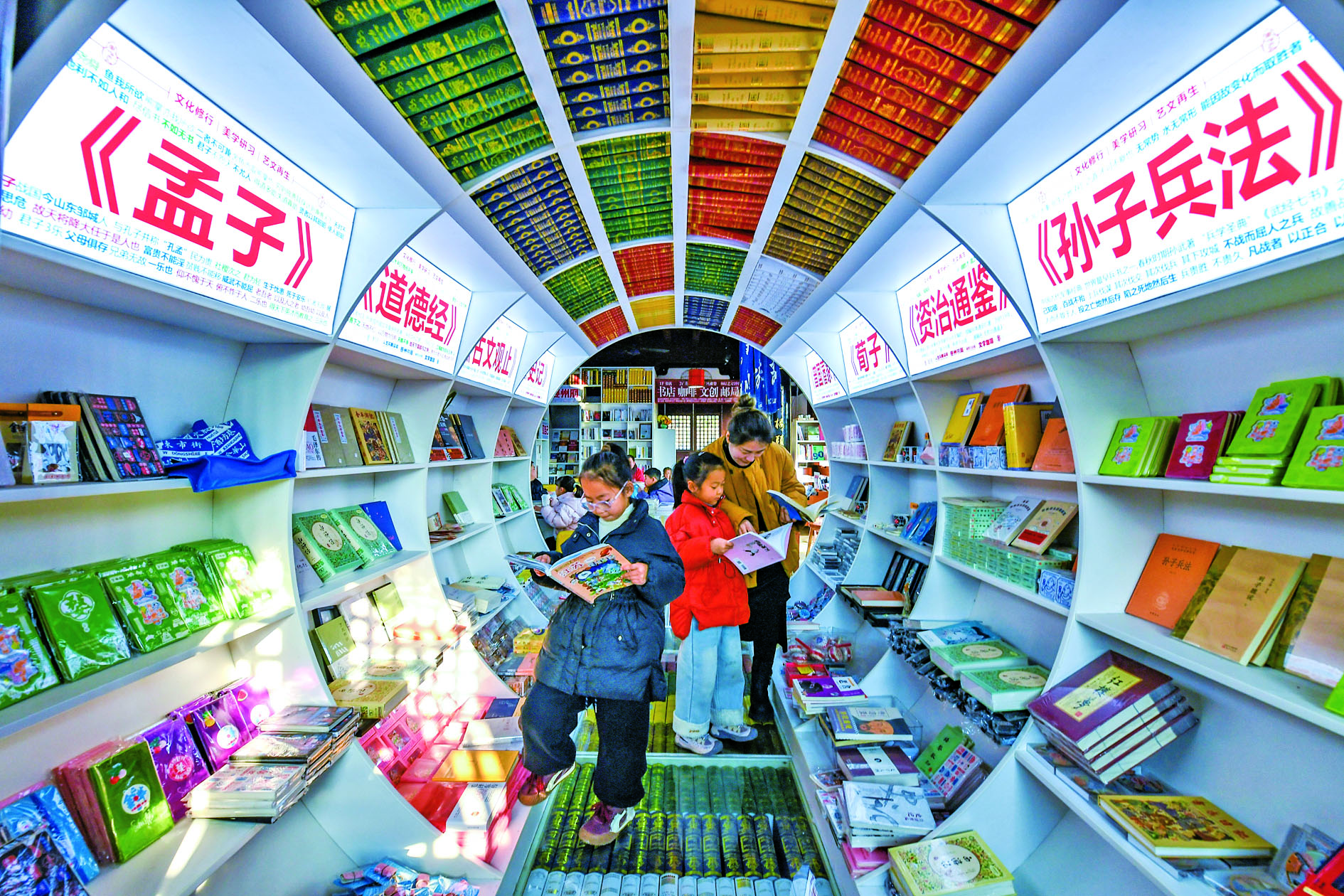 @马尚:在市区一家文创书店,家长和孩子在“时空隧道”书架边阅览图书,在书香陪伴中度过惬意时光。 时宽兵 摄