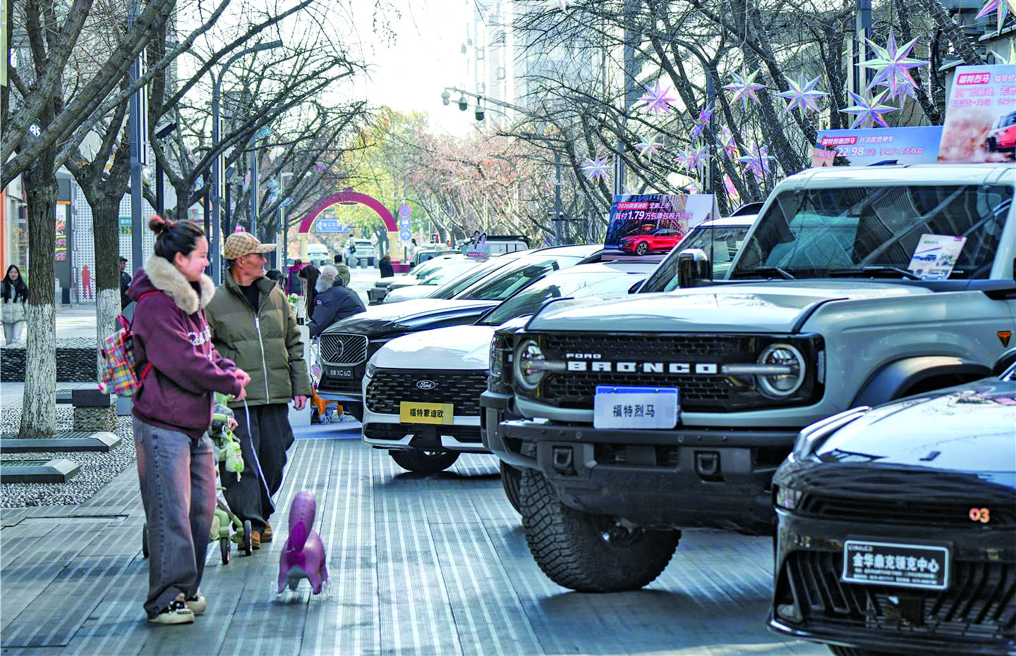 近日,在市区西市街商业圈,不少正在参展的汽车销售公司都推出多重促销政策,在国补基础上再加码,包括车辆购置税补贴、“0息”金融政策等,吸引市民前往咨询。 本报记者 李建林 文/摄