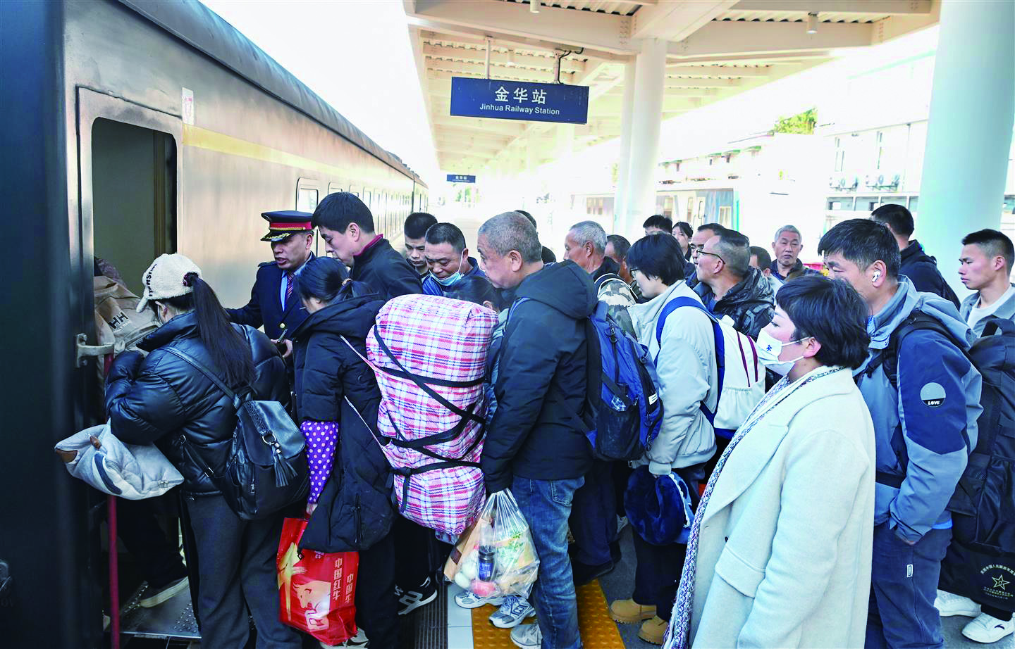 近日,从杭州开往成都的列车在铁路金华站停靠时,旅客们纷纷排队上车,其中不乏扛着大包小包的外来务工人员。随着春运及春节临近,铁路客流量近期逐渐走高。 本报记者 李建林 摄