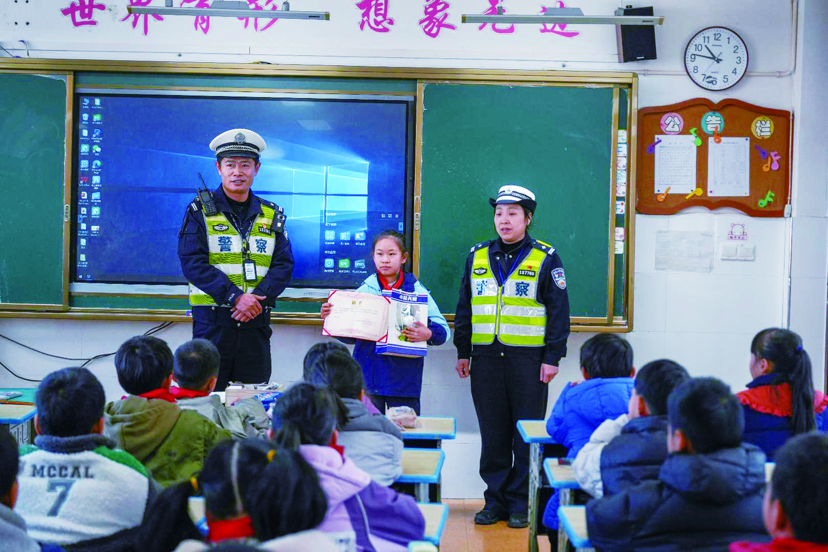 1月15日上午,承诺如期兑现。民警走进兰花小学四(4)班,不仅为何沐言送上了荣誉证书和“交警小熊”玩偶,还向全班师生讲述了前一晚发生在路口的正能量故事,并倡议大家要像何沐言一样当“小小宣传员”,把安全理念传递给爸爸妈妈、爷爷奶奶,用“小手拉大手”的力量,让文明出行成为每个家庭的自觉行动。