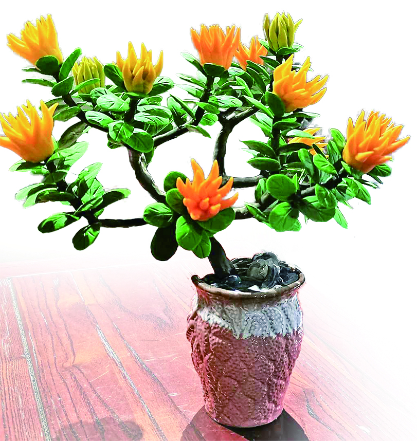 为还原佛手的真实形态,方晔频繁往返花市,观察佛手的生长姿态、叶片纹理,还买回细细拆解研究。起初,塑好的佛手叶子用胶水粘好后极易脱落,几次失败后,他灵光一闪,用铁丝做支撑,终于解决了难题。一盆面塑佛手盆景,要精心塑造14个佛手和200多片叶子,纯手工制作需耗时两天,成品逼真到让人难辨真假。