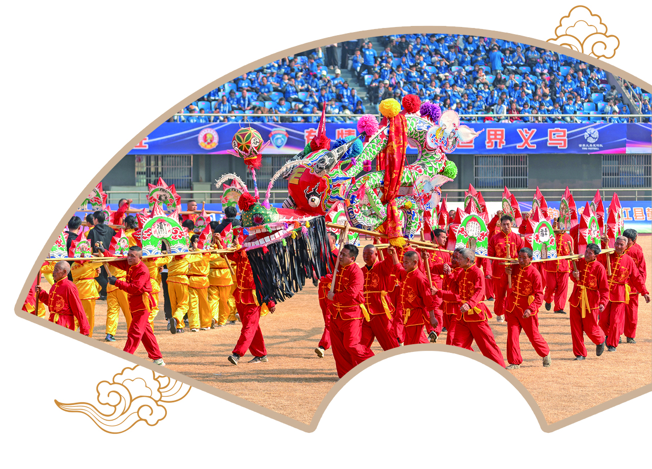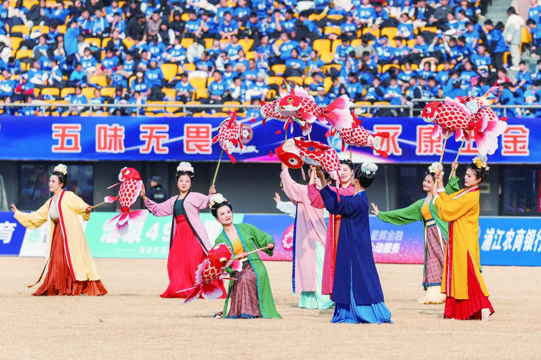 在昨天下午的“金超”赛场上,精彩的非遗表演成为赛前、赛中全场瞩目的焦点。浦江板凳龙与浦江擂马首次同台亮相,以昂扬之姿生动诠释“龙马精神”;浦江鱼灯与翻腾游龙交织共舞,演绎出一幅“鱼跃龙门”的生动画卷。