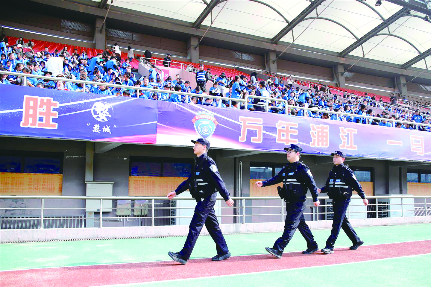 1月18日下午,2026金华市“八婺同心杯”足球超级联赛在浦江县体育中心拉开战幕。为保障赛事安全顺畅,浦江县公安局提前谋划、周密部署,严格执行“定岗、定人、定责、定时”要求,全面加强现场管控、交通疏导与秩序维护等工作。 图为浦江公安民警在浦江县体育中心巡逻安保。 潘再阳 摄