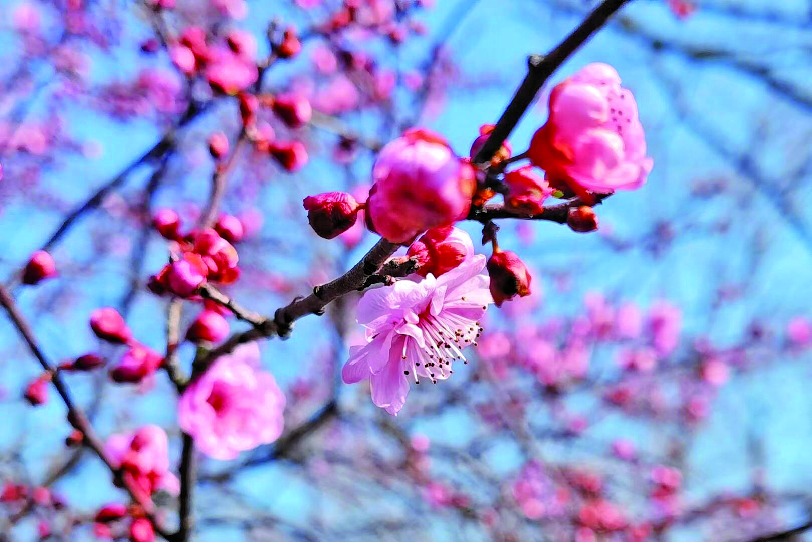 赏梅自古是一件颇有讲究的雅事,古人推崇 “花是将开未开好”,将梅花含苞欲放之时定为最佳赏梅期,故名“探梅”。据介绍,我市园林绿化中栽植的梅花以宫粉梅、绿萼梅、玉蝶梅、美人梅等品种为主,整体最佳观赏期在2月至3月,其中美人梅花期最晚,最佳观赏期在3月份,届时将为金华的春日再添一抹梅韵。
