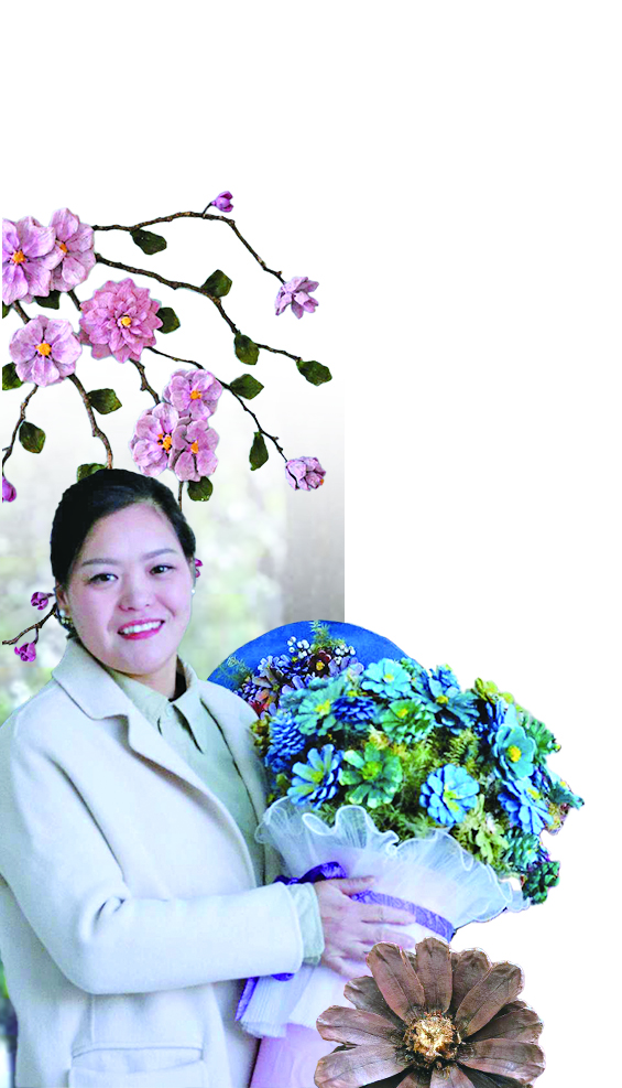 @梅朵:“前几日做的红梅,今日做的粉梅。”在黄巧先的朋友圈里,一组梅花立体画惊艳了众人。红、粉梅花绽放在浅蓝肌理的画框中,枝干苍劲、花瓣灵动,可走近细看才发现,这些梅花都是用松果、枯枝拼贴而成。看似普通的自然废弃物,在她的手中摇身一变,成了兼具艺术感与自然气息的花艺作品。