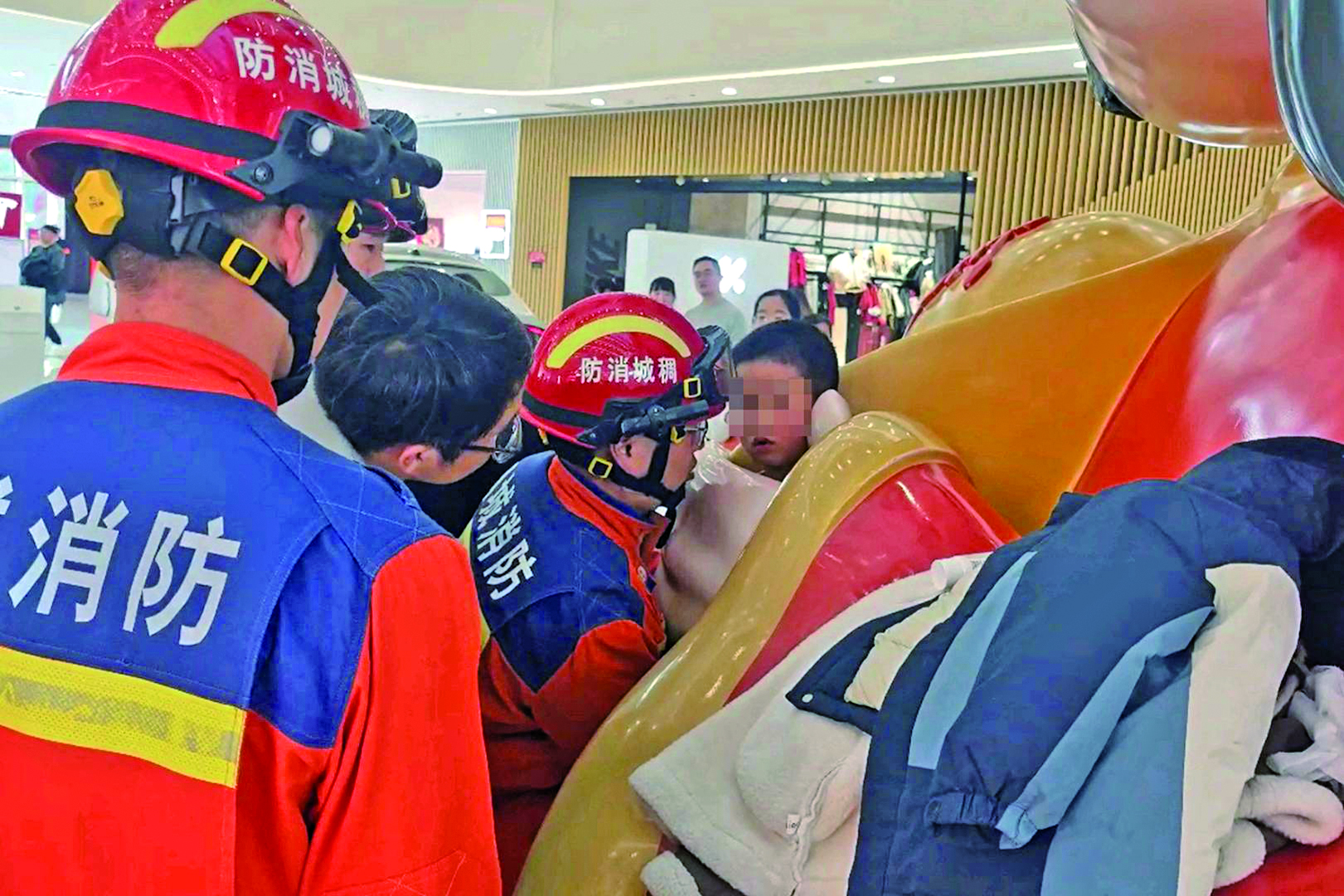 温馨提醒:商场、广场等公共场所的大型装饰雕塑及设施并非游乐器具,其结构与材质可能存在不确定的安全风险。请勿随意攀爬、钻入,家长应切实做好监护与安全教育,防范“卡头、卡手”等意外事件。如遇紧急情况,请保持冷静,及时拨打119求助,等待专业救援。