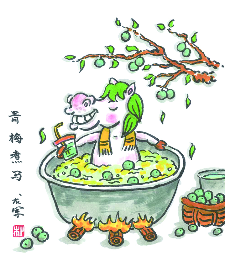 龙军的作品总有一些符合时代气息的创新表达,诙谐幽默。除了作品《青梅竹马》,他还创作了另一幅“姊妹”作品《青梅煮马》:一匹马坐在一口装满了热水的锅里,锅底烤着火,头顶是挂满枝头的青梅,马的表情十分惬意,仿佛正在泡温泉。拟人化的表达,是龙军漫画作品的一大特色。