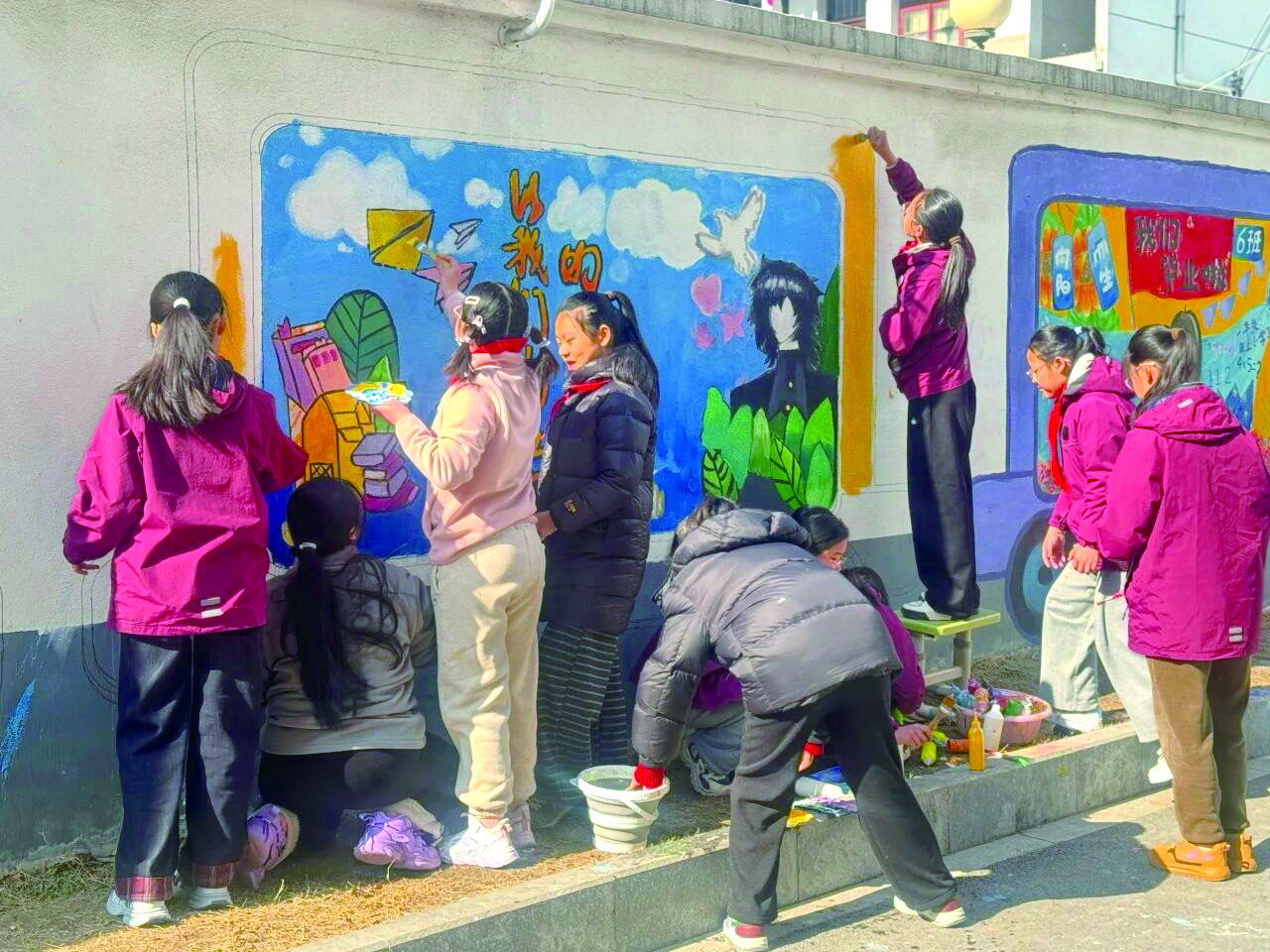 此次墙绘活动以一列十节车厢的“青春列车”为载体,同学们描绘了六年来的欢声笑语,以及寄托奔赴广阔山海的梦想。活动开始之前,各班同学围绕主题进行热烈讨论、精心构思,将班级特色与成长期许融入创作中。