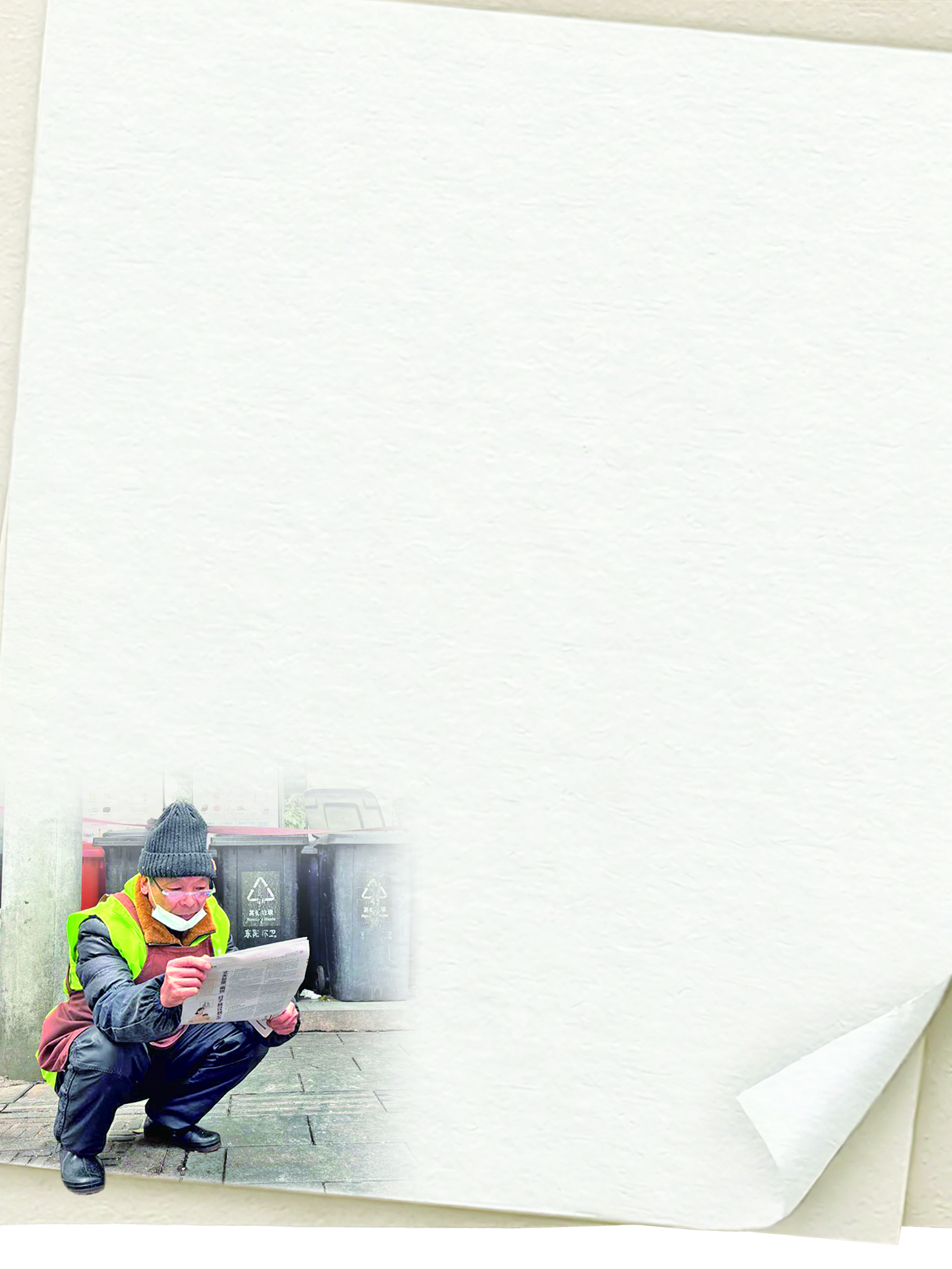 “冬天这么冷,为什么蹲在外面读报纸,不进工作间呢?”记者疑惑道。老人解释,9时前是自己的“上班”时间,万一有人来投放垃圾,怕他们看不到,耽误工作。于是,蹲在垃圾站前读报成了他的习惯。