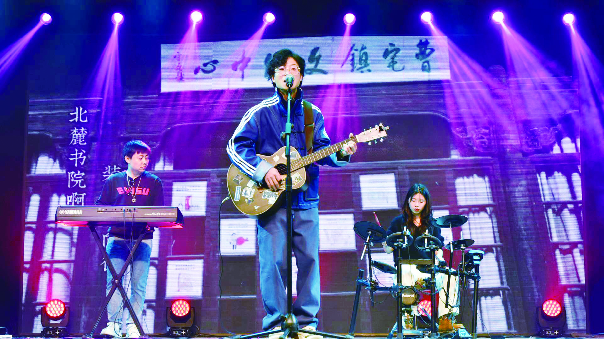 台前幕后,曹敬敬切换自如,助力学生屡屡登上金东区村晚的舞台。2023年,他和学生同台演唱《我在金东过大年》。2024年,他指导的少儿乐队带来一曲《稻香》。“为了这个节目,孩子们排练了很久。他们的形象和演奏水平都非常好,但是其中两个孩子一上台就特别紧张。”眼看着上村晚的日子越来越近,曹敬敬想出一个办法,每天带着孩子们去校门口、超市门口等人流量大的地方路演。经过一次次“小舞台”的训练,这两个孩子克服了紧张,在舞台上呈现了精彩的表演。