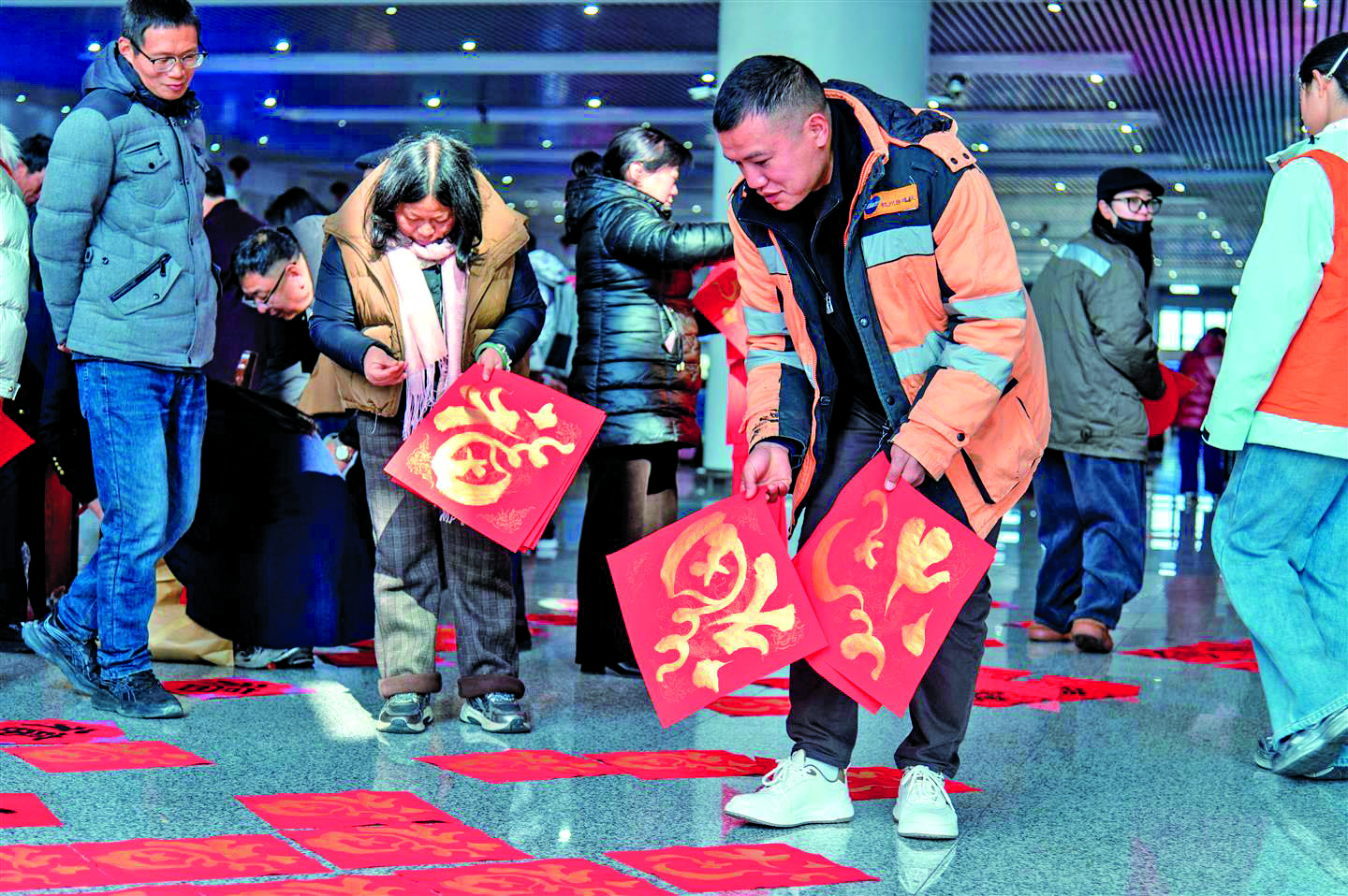 2月2日,春运首日,在铁路金华站,携带着大包小包的旅客有序进站,登上返乡的列车。候车大厅里,旅客领取现场书写的“福”字和春联,踏上温暖回家路。