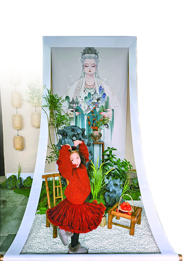 古老的祠堂内,一幅幅独具巧思的画作仿佛破开“次元壁”,与前来观展的人们建立了奇妙的联结。在一幅名为《怀山育境》的作品前,画中是一位眉眼温柔的女子,下面布置着微缩版的假山和生机勃勃的绿植,摆放着农村常见的竹椅,白色的画框自上而下低垂于地,吸引人们纷纷“入画”拍照打卡。“这些绿色植物代表坛头湿地,我想营造的,就是湿地如绿洲般治愈人心的感觉,让古宅、生态和现代艺术紧密交融。”插画师鱼雨桐向参观者解说着。