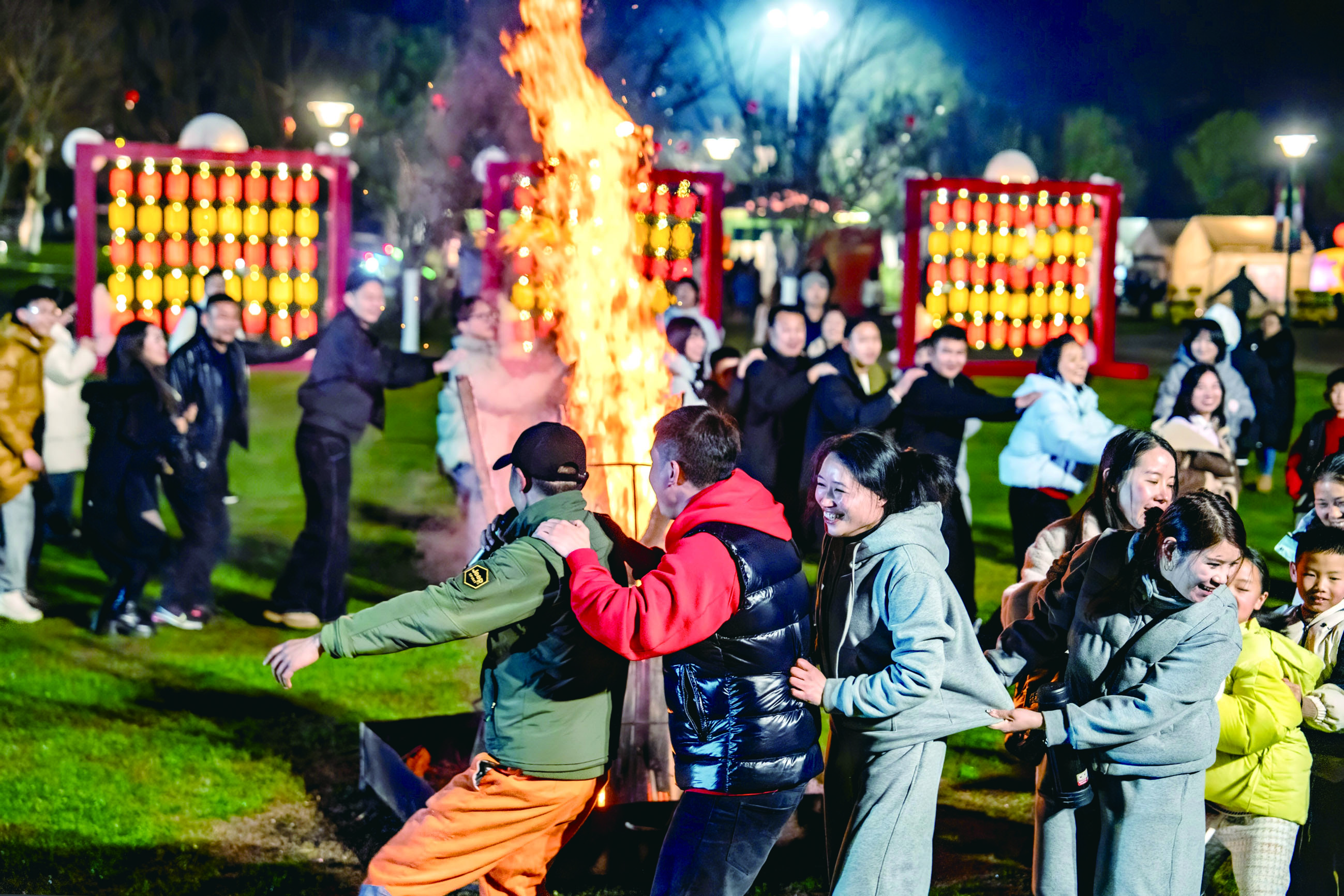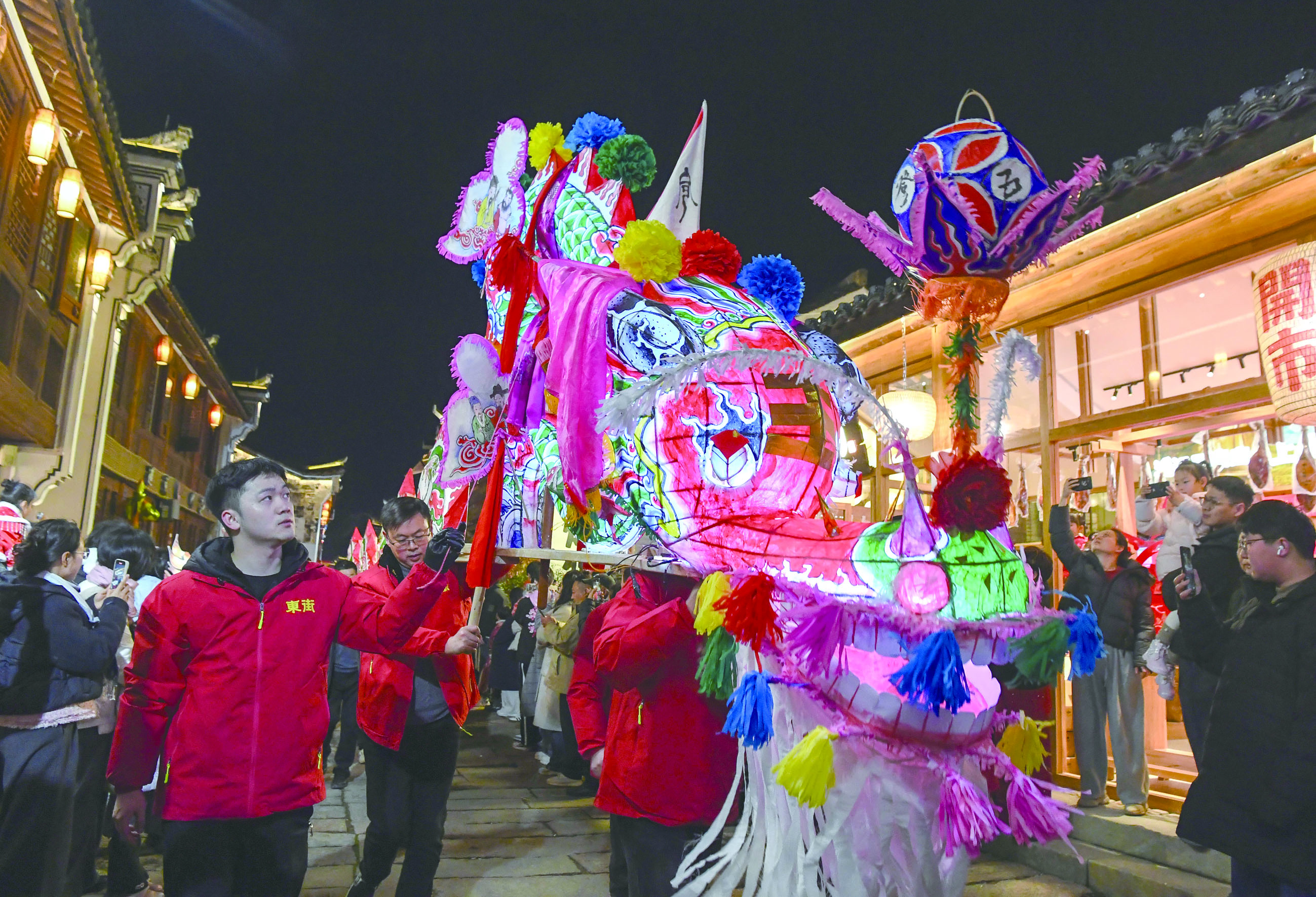 总台春晚义乌分会场主舞台全球数贸中心,市民、游客争相与春晚“同框”,年味是炫酷;永康市花街镇山后胡村的村民四代同堂吃年夜饭,年味是团圆;金华山双龙灯会邀市民、游客共赴灯火之约,年味是热闹;浦江东街龙灯巡游、鱼灯展演,年味是传承……春节假期,中国红铺满八婺大地,喧嚣的人潮、绚丽的灯光,铺陈出烟火气十足的幸福年。