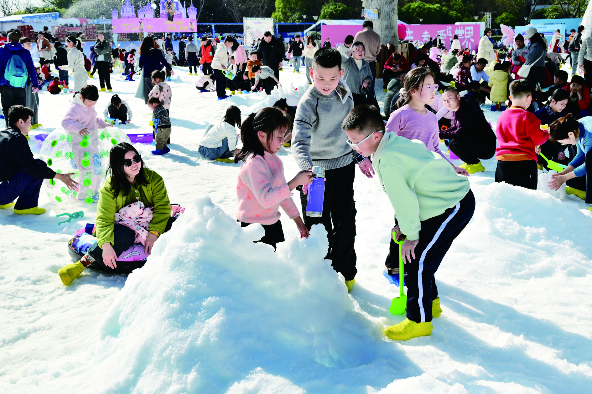 昨天,在婺城区万泰广场的“婺城奇幻冰雪季”现场,6000平方米的“冰雪大世界”吸引不少市民游客带孩子前来赏冰玩雪,体验冰雪乐趣。 时补法 摄
