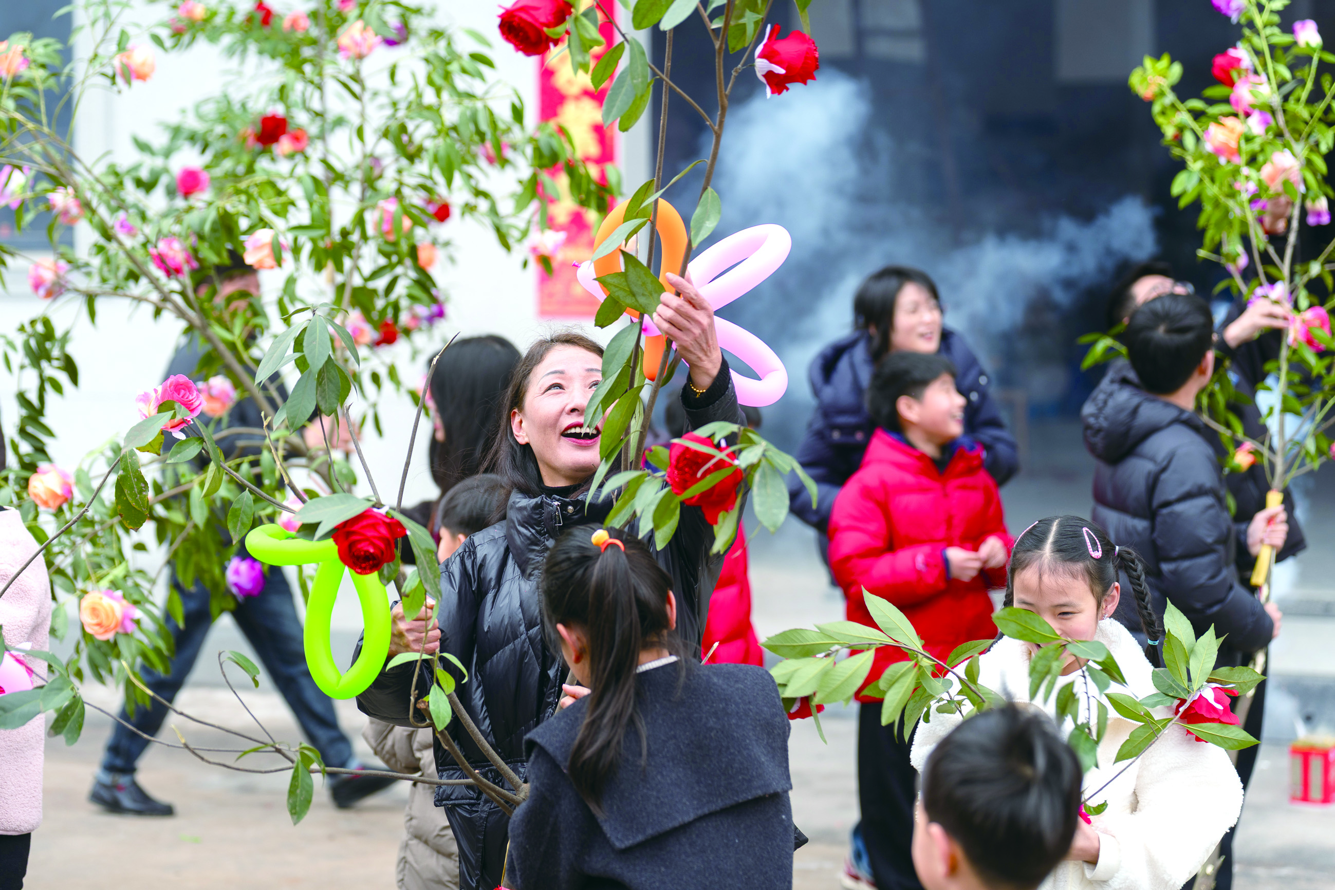 2月27日,金东区孝顺镇让河村和南仓村村民迎来了一年一度的传统民俗活动——“迎花树”,包含花龙巡游及抢摘花树等,现场十分热闹。 本报记者 楼冀阳 摄