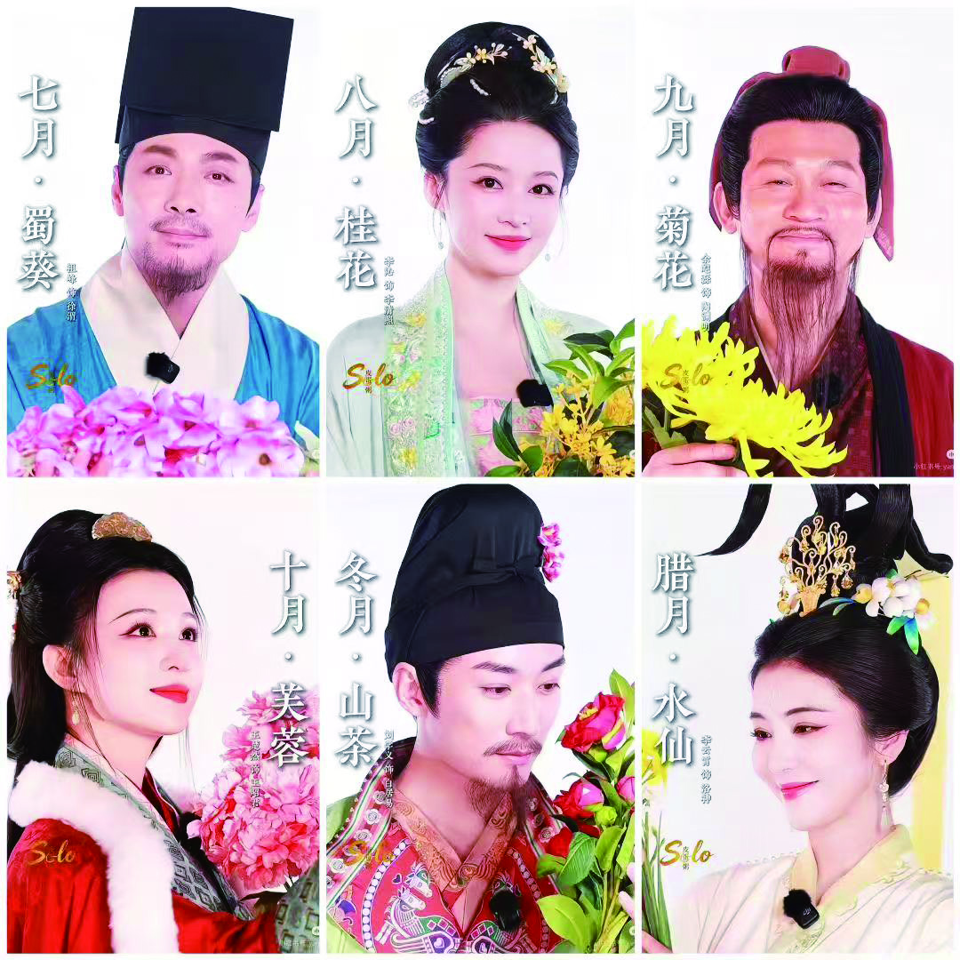 《贺花神》的灵感来自故宫博物院藏品“白玉月令组佩”。12个月,12种花,12位与花相关的历史人物——从正月的林逋到十二月洛神。节目要求每个造型既要贴合人物身份,又要体现花的特质,还要经得起4K高清镜头的检验。