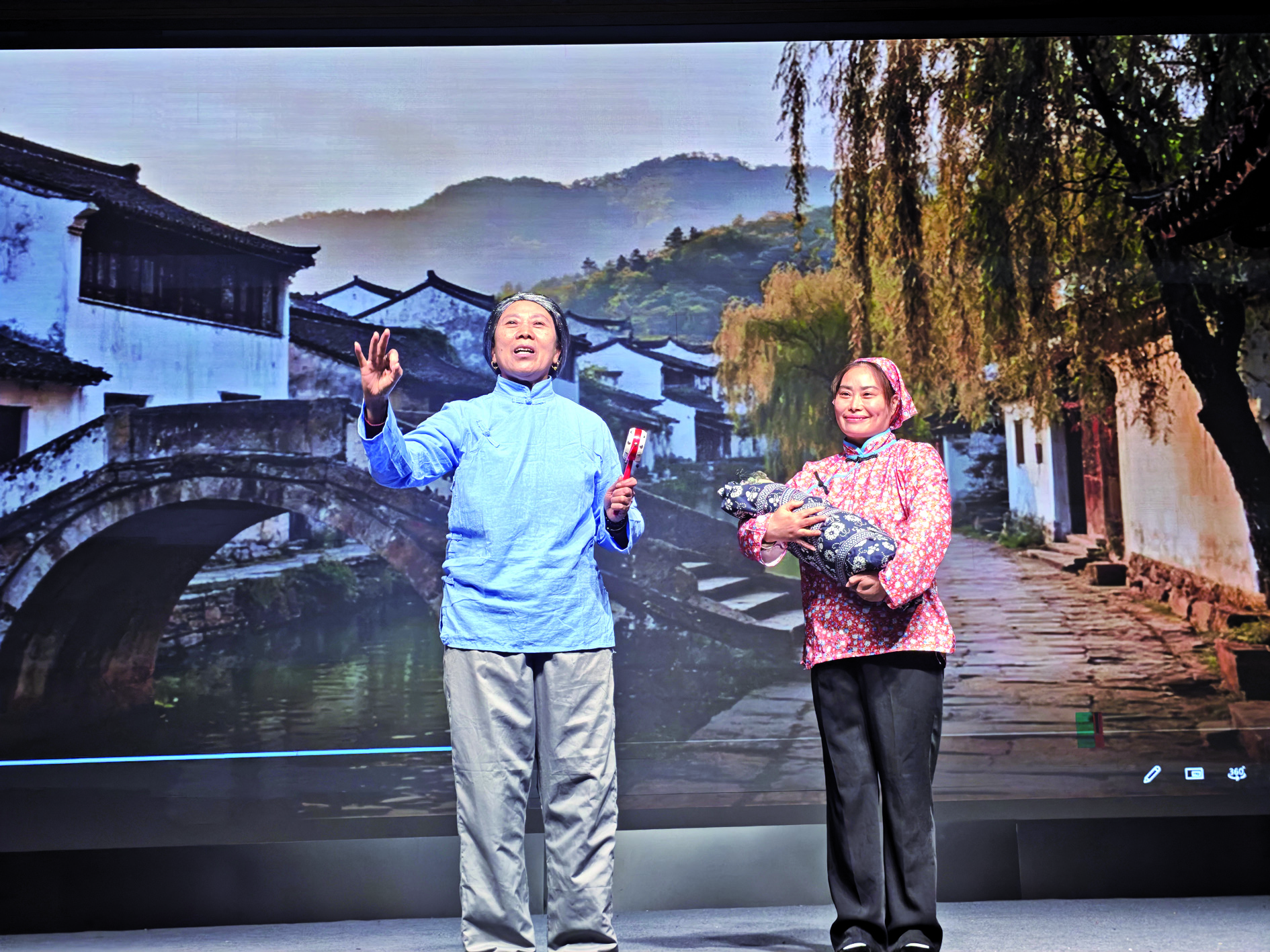 这部让村民们如此投入的情景剧,讲述的正是严店村自己的故事。由派驻村里的省级文化特派员程李萍联手省曲艺杂技总团策划指导,它以村里流传的严子陵后裔严必胜、严孟珍等传说为蓝本,结合了村中真实的古迹“寿星桥”等元素,将严氏家族高风亮节、心系乡亲的精神内核,化为了舞台上的一幕幕场景。