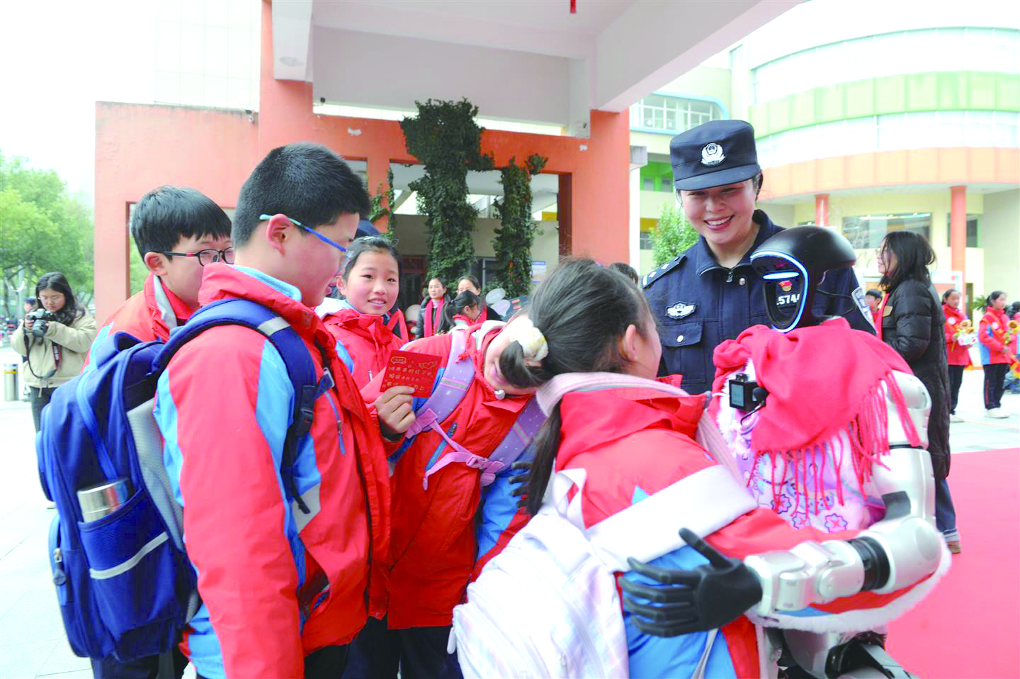 昨日是我市中小学开学日。在东阳市吴宁第五小学校门口,东阳市公安局吴宁派出所民警与一个“类脑具身智能机器人”同时开展护学执勤。该机器人具有巡逻、语言互动、门岗登记、紧急情况公安互动等功能。 蔡伟华 摄