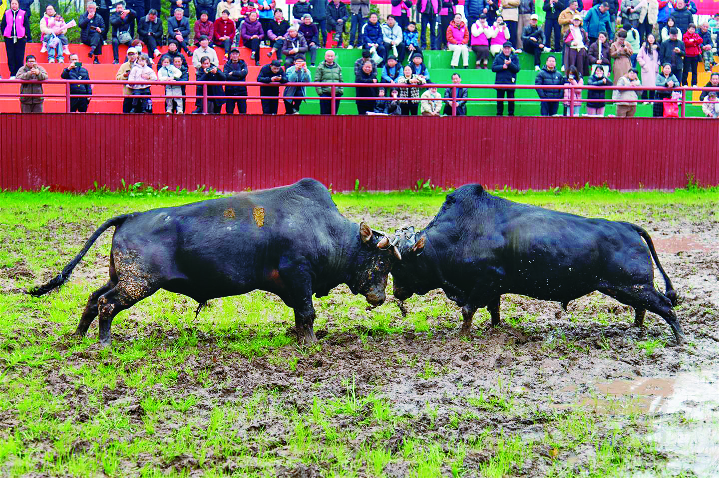 3月8日,婺城区雅畈镇汉灶村斗牛场地上,激烈的非遗斗牛活动吸引现场观众的目光。当天,婺城区妇女联合会、金华市斗牛协会联合主办“非遗承载公益 关爱妇儿未来”公益慈善斗牛活动。活动门票收入全额捐入婺城区妇女儿童关爱基金,专项用于帮扶困境母亲、关爱留守儿童,助力女性创业创新、促进儿童健康成长,营造全社会尊重妇女、关爱儿童的良好风尚。 本报记者 胡肖飞 摄