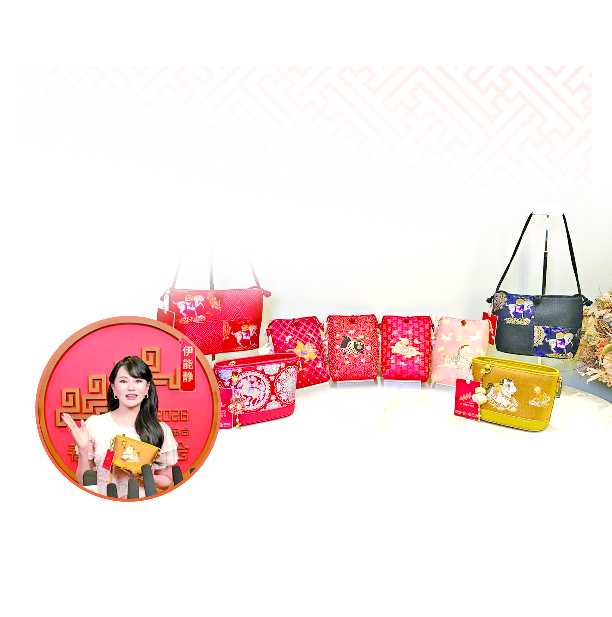 年前,张小婉等多位影视演员背着总台文创联名宋锦包穿梭在春晚彩排现场,红色的包身,融合宝相花纹、福袋等中国传统纹样元素,吸睛无数。总台春晚会场上,伊能静手持“萌马送财”包向全国观众送上新春祝福,将“马上有钱、马上有福”的美好寓意传递给亿万观众(见上图)。转眼这款包就出现在了2026年元宵晚会的节目中。“萌马送财”包将宋锦面料与皮具相结合,融合了传统吉祥纹样与萌趣风格,小萌马脚踏祥云驮着元宝如意奔驰而来,搭配葫芦挂饰,既灵动又可爱,也蕴含“马到成功”“万事顺遂”“马上有福”等寓意。春节期间,六环饰品这8款总台春晚联名宋锦包自上架以来深受消费者喜爱。这些包均采用真丝宋锦面料,将马纹、祥云、宝相花、银锭纹等传统纹样,与葫芦、元宝、福袋等吉祥元素巧妙融合,打造出《萌马送财》《神驹献宝》《万华呈祥》《四合如意》等多款既实用又有文化内涵的产品。