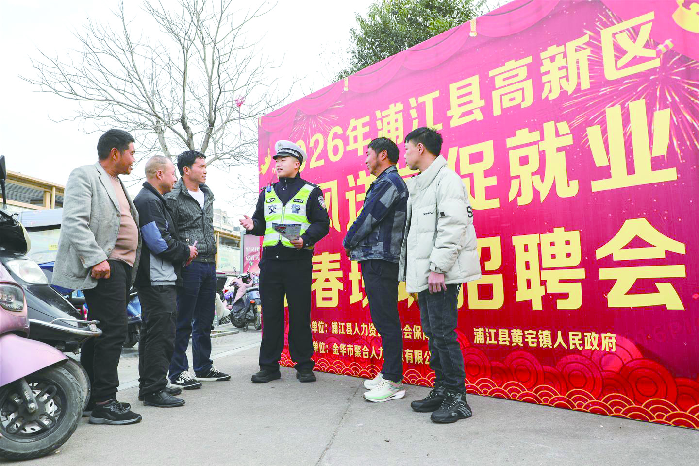 为提高群众交通安全意识和自我防范能力,浦江县公安局交通管理大队借助春季招聘会人流集中的优势,组织警力走进现场同步开展交通安全宣传活动,为求职上岗的应聘人员上好开工交通安全“第一课”。图为民警向求职者普及“一盔一带”交通安全知识。 通讯员 杨晓东 摄