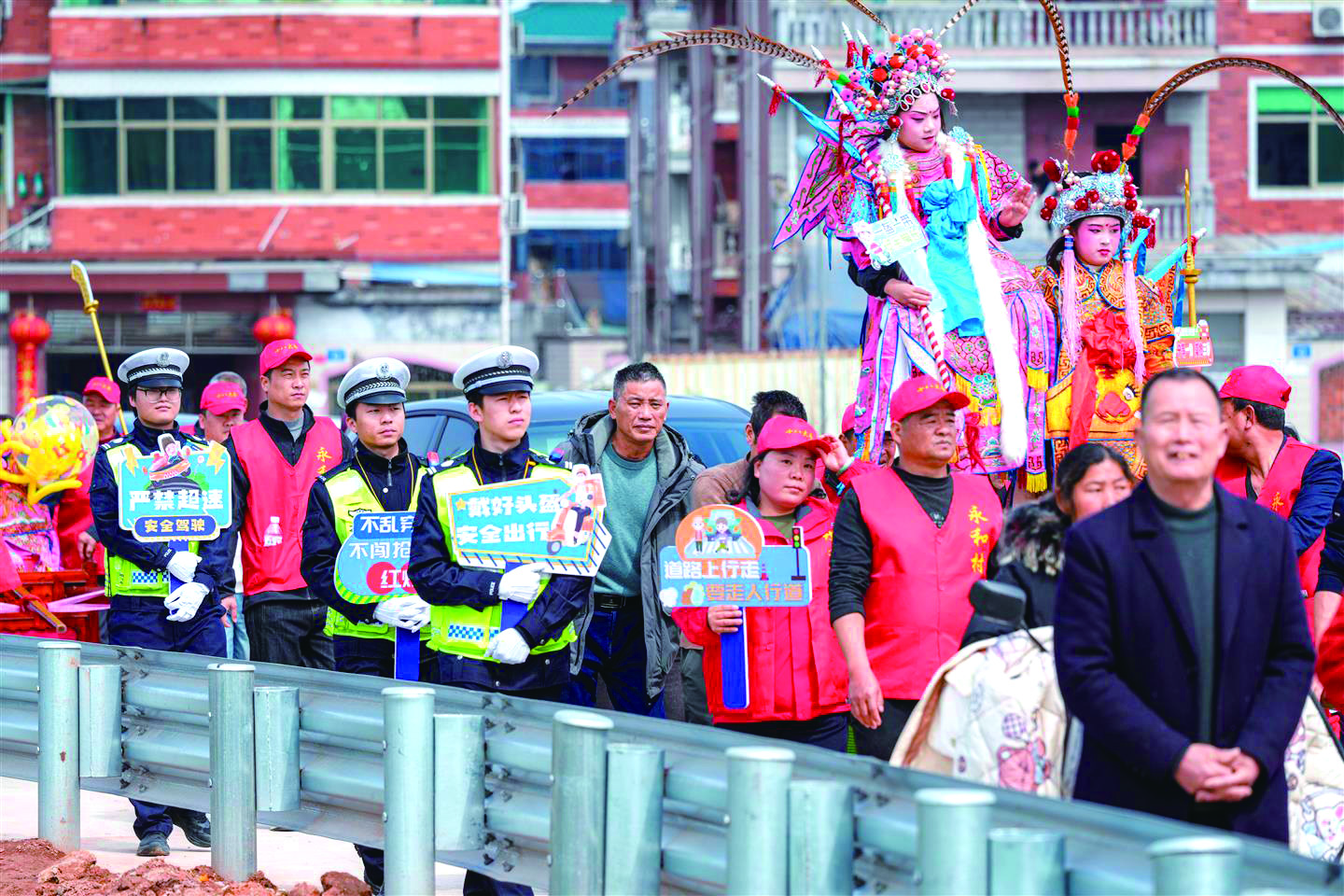 3月6日上午,义乌市江东街道永和村举办非遗“抬阁跷”大型民俗文化活动,吸引了上万群众驻足观看。义乌市公安局交警大队民辅警在做好活动现场秩序维护及服务群众等工作的同时,开展“赏非遗 学交规”宣传活动,将交规与非遗跨界融合,向群众普及交通安全知识,增强广大群众的交通安全观念。 通讯员 郑圻冬 摄