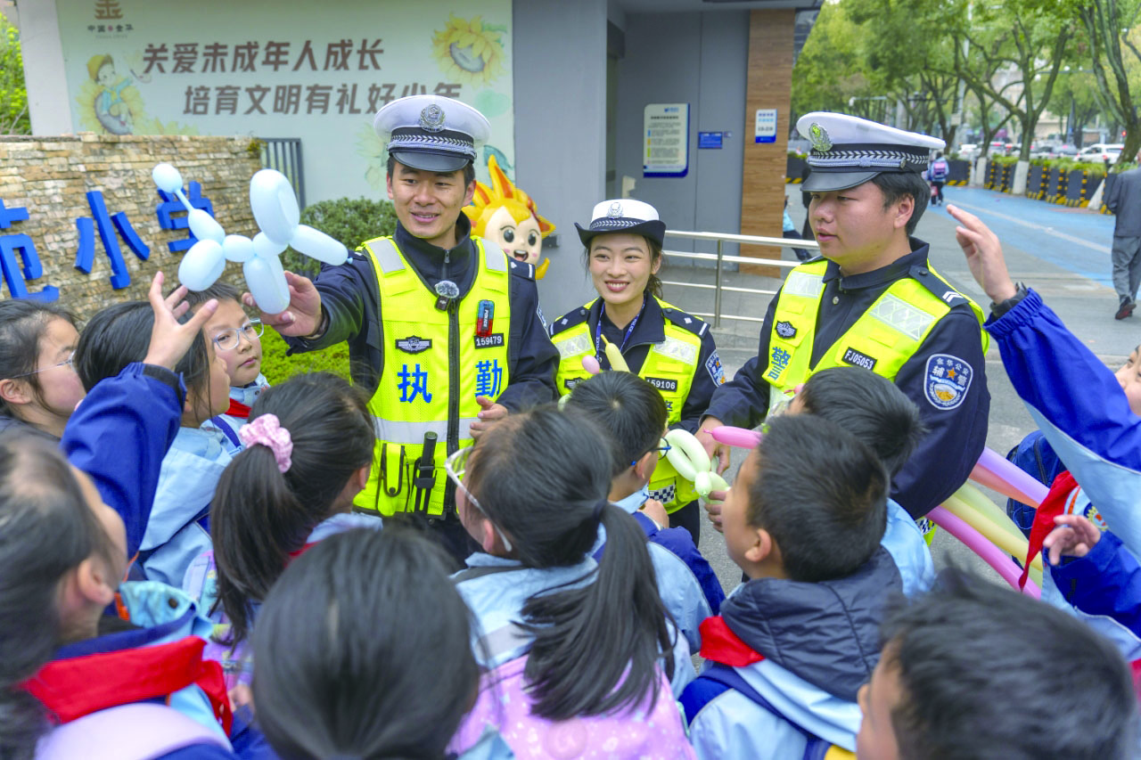 3月4日,金华市各中小学全面开启新学期。在金华市东苑小学校门口,一堂特殊的“开学第一课”没有刻板的说教,却充满了欢声笑语。金华市公安局交管支队警员用扭扭棒手工制作的“气球小狗”,叩开了孩子们的心扉,让交通安全知识在指尖与欢笑中入脑入心。