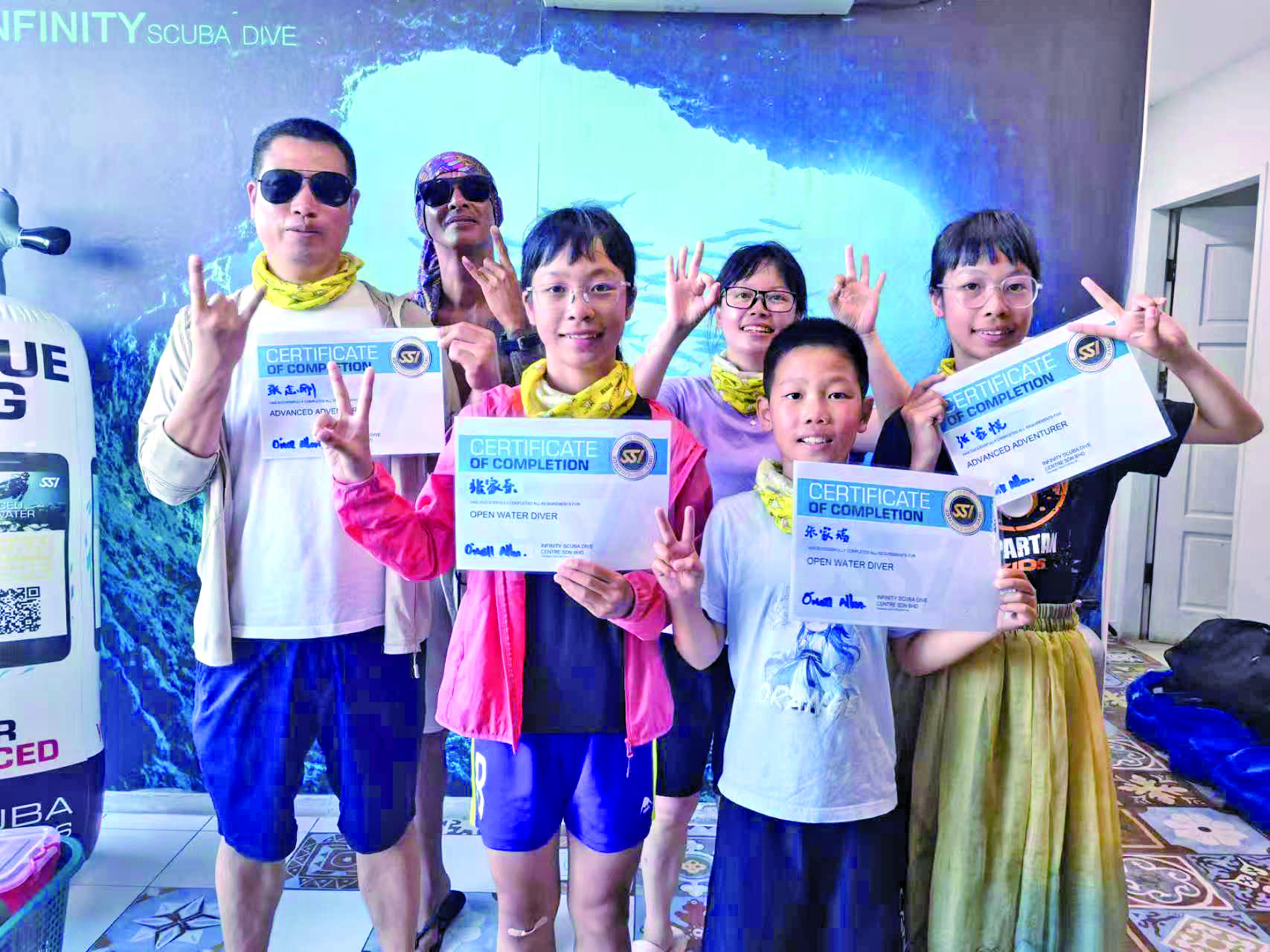 @city达人:义乌有一位38岁的母亲,带着丈夫和三个孩子,完成了一次特别的全家成长体验:一家五口全部考取OW开放水域潜水证,其中三人顺利拿下AOW进阶开放水域潜水证。从最初的忐忑不安,到沉醉海底、流连忘返,一家人在深海中彼此陪伴、共同挑战,用一场温暖而勇敢的水下探索,书写了一段特别的亲子时光。