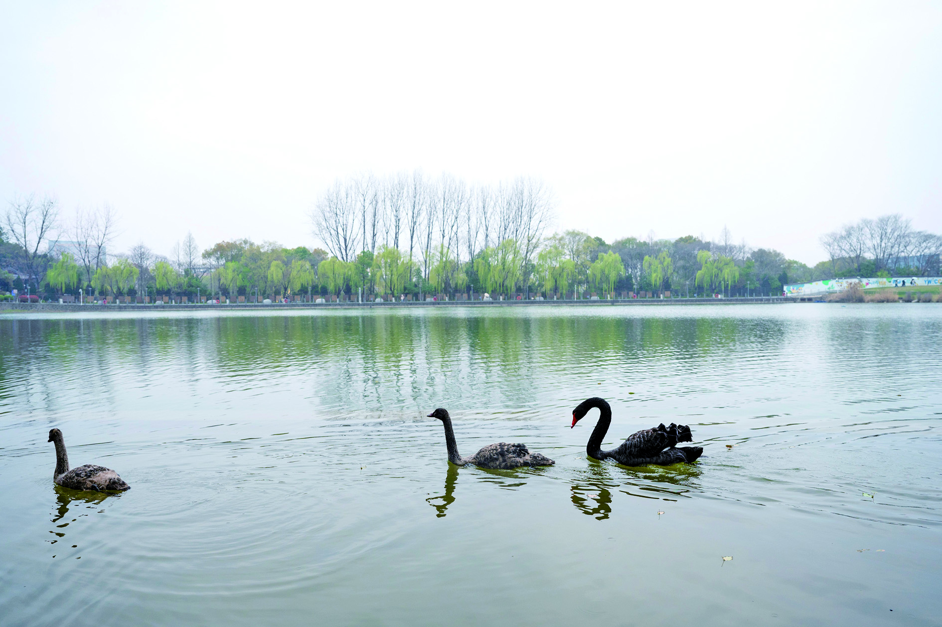 3月22日是世界水日。前天上午,义乌工商职业技术学院群英湖碧波荡漾,一群黑天鹅在湖面悠然游弋,成为校园里一道灵动的生态风景线,也是校园生态治理与节水护水成果的直观体现。 本报记者 钱旭升 文/摄