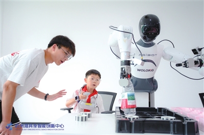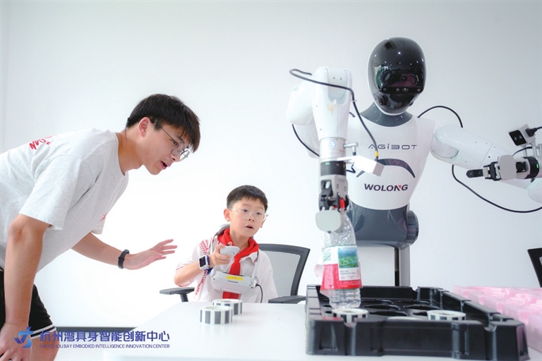 杭州湾具身智能创新中心由曹娥江经开区主导建设,本地龙头企业卧龙集团、国内具身智能头部企业智元机器人按照市场化方式合作共建,联合浙江大学、复旦大学等高校开展紧密型嵌入式合作,共同搭建数据采集中心、人才培训基地、技术交流平台和产业赋能平台,形成“采—存—训—用”闭环体系,推动具身智能机器人走向真实工业场景,助力制造业向柔性化、智能化转型。杭州湾具身智能创新中心就像一个“科技亮点”汇聚之地。在这里,前沿技术不再是实验室里的“秘密”,而是能让青少年近距离接触的“科普教材”。