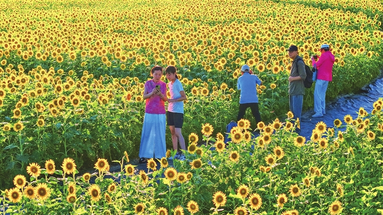 8月12日,上虞区体育中心康体路旁,60余万株向日葵进入花期,形成一片金色海洋,吸引众多市民游客前往打卡。这片由收储土地改造的“城市花海”,通过种植向日葵、荞麦等季节性花卉,既美化市容又拓展生态空间。