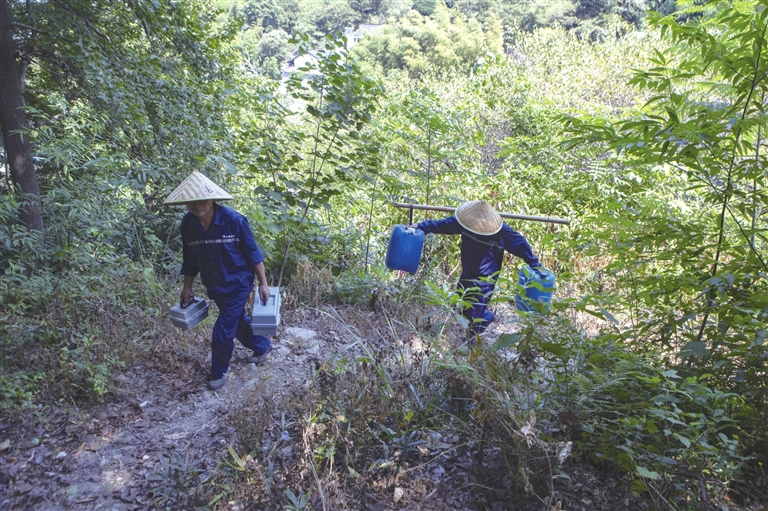 持续高温致使山区饮用水受到严峻考验。位于丰惠镇丰南村高山顶上的小南山农村供水站,承担着山区36户村民的供水任务,连日来,供水运维人员头顶烈日,开展水质检测,查看水源流量,维护净化设备,检查供水管道,用责任与坚守保障农村群众夏日用水无忧。图为供水运维人员正将净化水物资运送至高山供水站。 记者 朱胜钧 摄