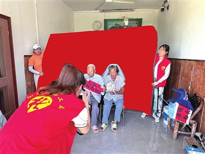 考虑到部分老人行动不便,无法前往文化礼堂,社工团队还将服务延伸至老人家中。烈日炎炎下,社工人员逐户登门拜访,细心为老人整理衣装、舒缓情绪,并巧妙利用老人熟悉的厅堂院落,营造出温馨自然的拍摄场景。建塘村顾爷爷望着社工汗湿的衣衫,动情地表示:“这么热的天还专门上门来,真是太感谢你们了!”朴实的言语,传递出民生服务直达“最后一米”的真挚温度。