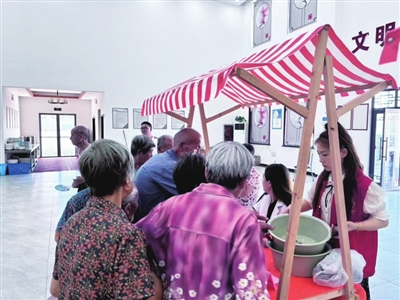 活动现场更涌动着烟火暖意——刚出炉的米胖裹挟着谷物香气弥漫全场,成为老人们青睐的“暖心小食”;义卖区域人气高涨,村民们在挑选物品的过程中,传递着邻里互助的善意;旧物置换、垃圾分类宣传专区前,志愿者用通俗语言解读环保政策,结合实物演示教大家区分可回收物与其他垃圾,引导绿色生活理念融入日常。“每个月19号就盼着这活动!理发、修家电不用跑远路,还能换实用东西,太贴心了!”村民王阿姨拿着修好的电饭煲笑着称赞道。
