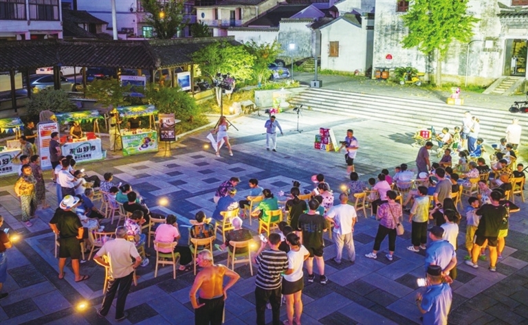 本报讯 (记者 宋彦佩 通讯员 金汉卿) 古朴与现代交融,活力与激情释放。前些天,上浦镇董家山古村落迎来一场别开生面的乡村音乐节。村民们与游客在邻里广场泼洒创意,芦帽彩绘、扇面涂鸦等非遗手作焕发活力;新潮乐队、莲花落非遗演唱与民谣串烧轮番上演,星空下的古村落满是烟火气与艺术感,别有一番风情。