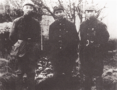 1942年8月,在慈北鸣鹤场建立了统一领导浙东地区武装的司令部,即第三战区淞沪游击队三北游击司令部(简称三北游击司令部)由何克希为司令,谭启龙(中)为政委,刘亨云(左)为参谋长,张文碧(右)为政治部主任。